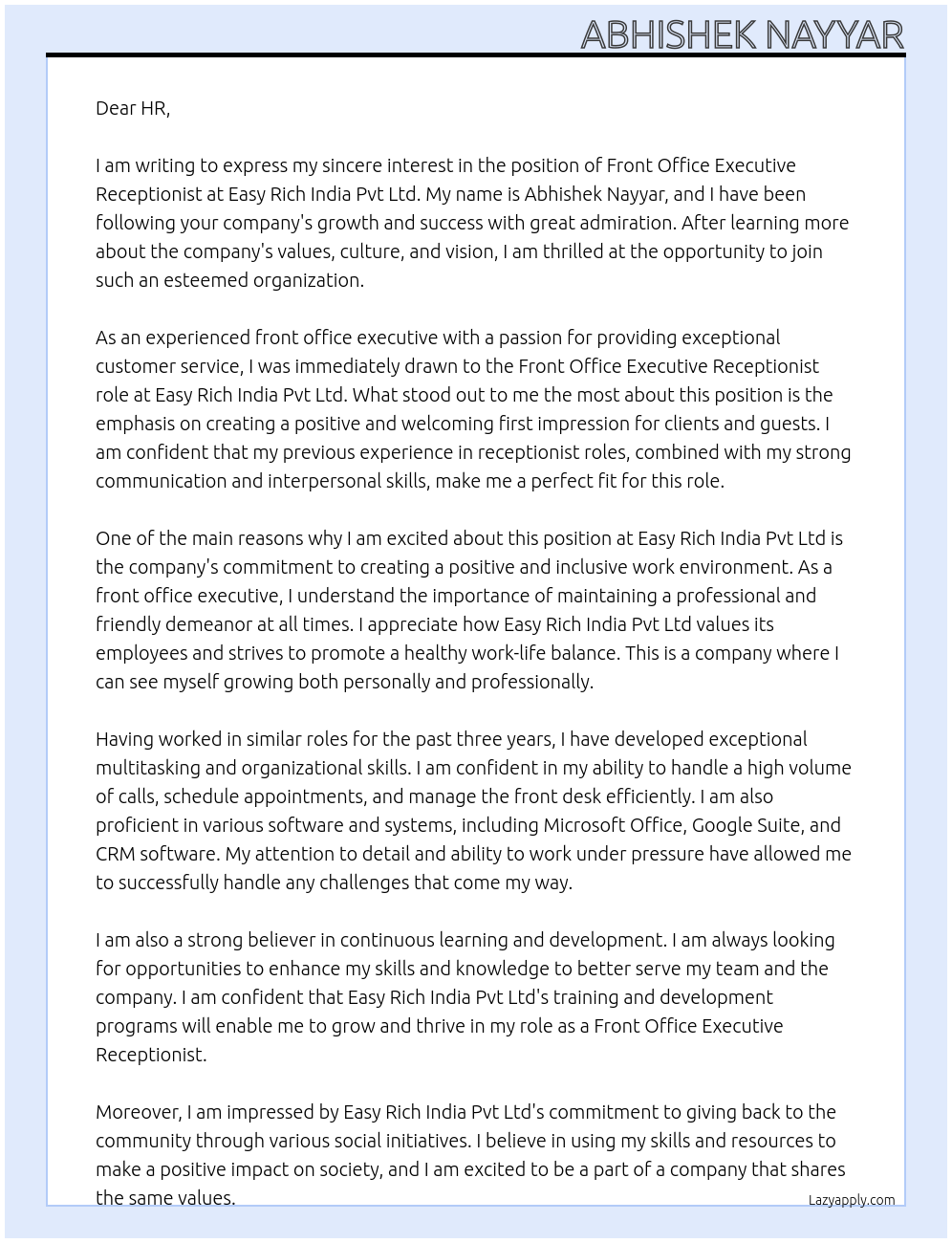 Front office executive receptionist Cover Letter At Easy rich India pvt ltd