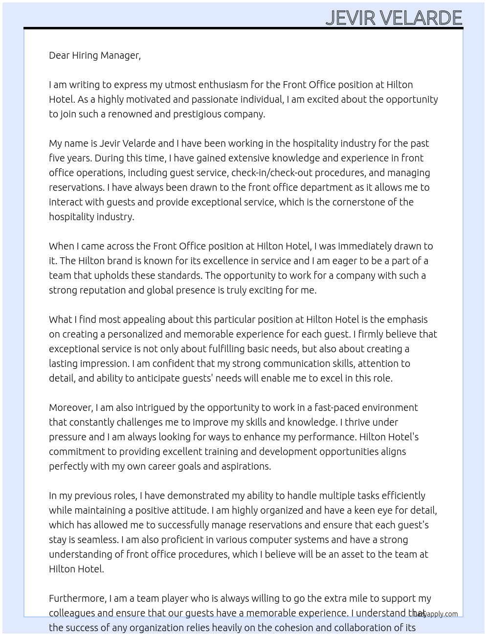Cover letter for front office - LazyApply