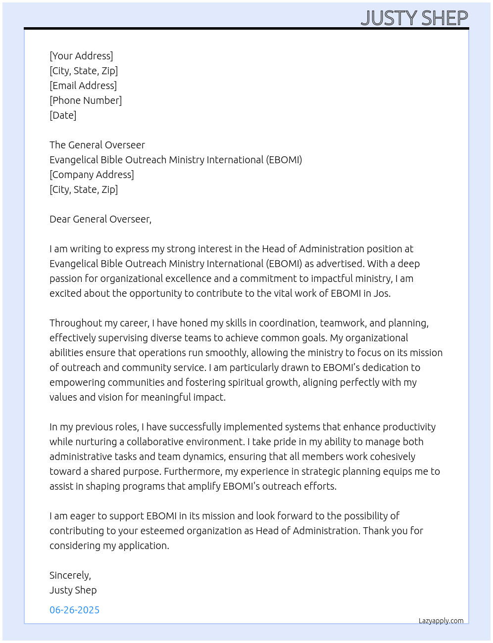 Head of Administration Cover Letter At Evangelical Bible Outreach Ministry International (EBOMI)