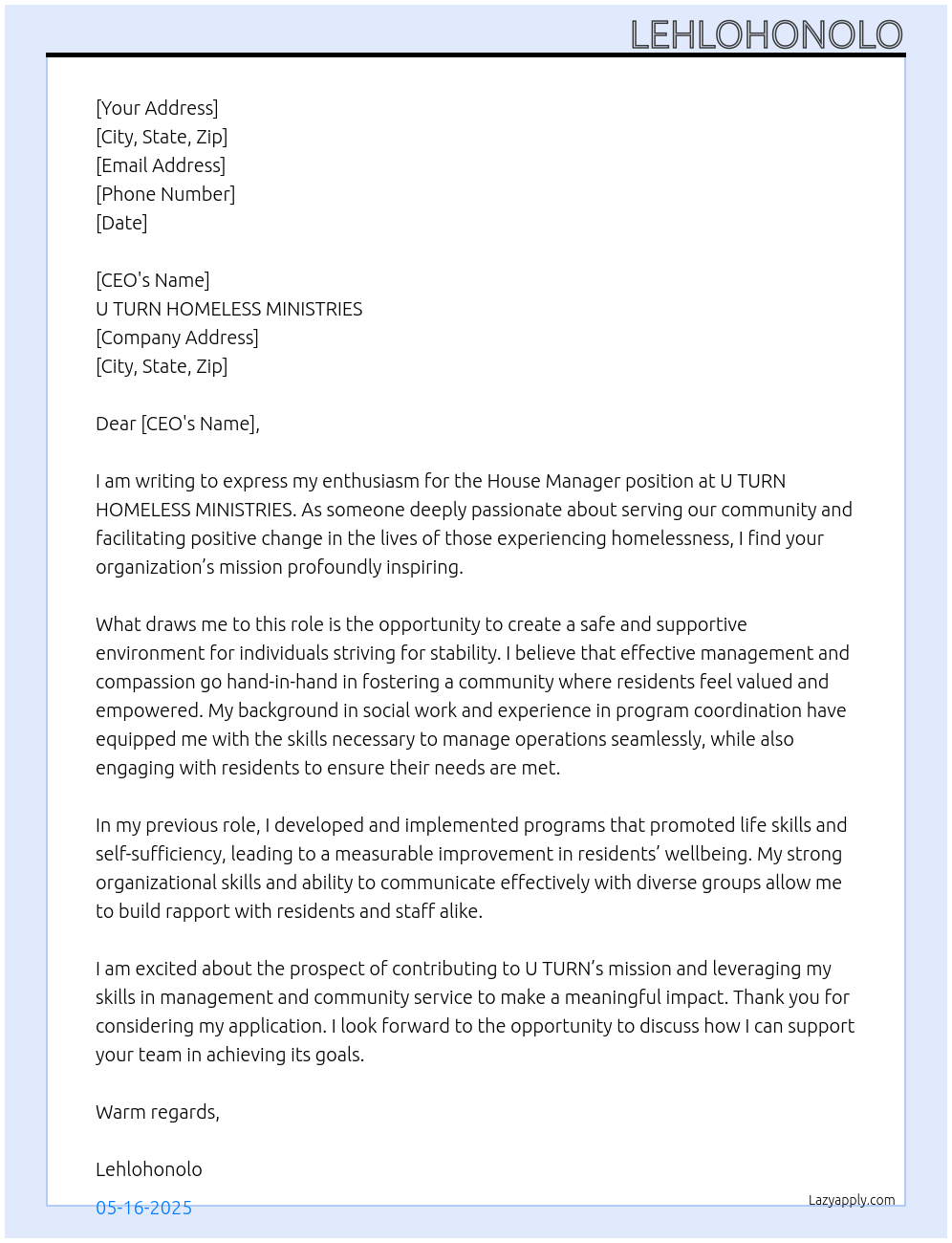 House Manager Cover Letter At U TURN HOMELESS MINISTRIES