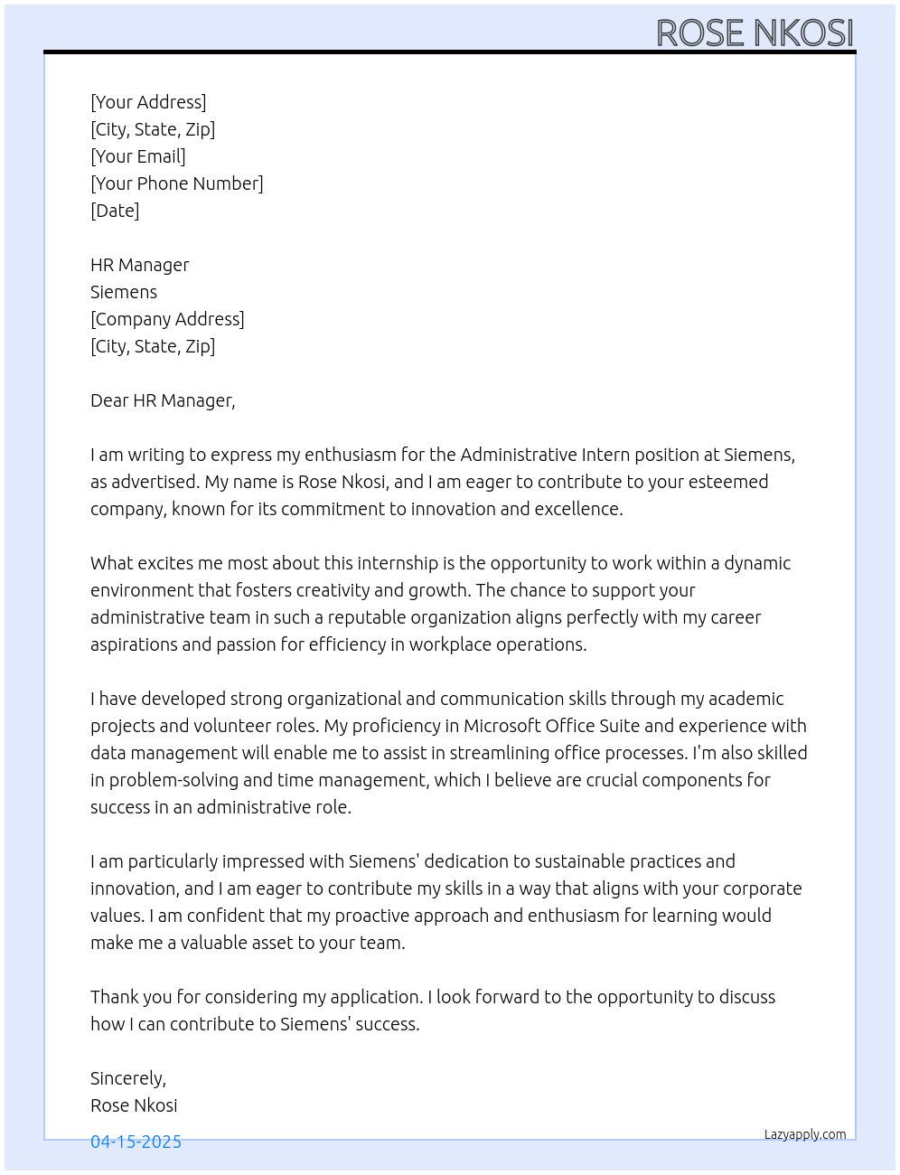 Check out these intern administrative cover letter sample and examples previously used by job seekers to land on job interviews as intern administrative. Use our AI cover letter generator to create a personalized cover letter as intern administrative.