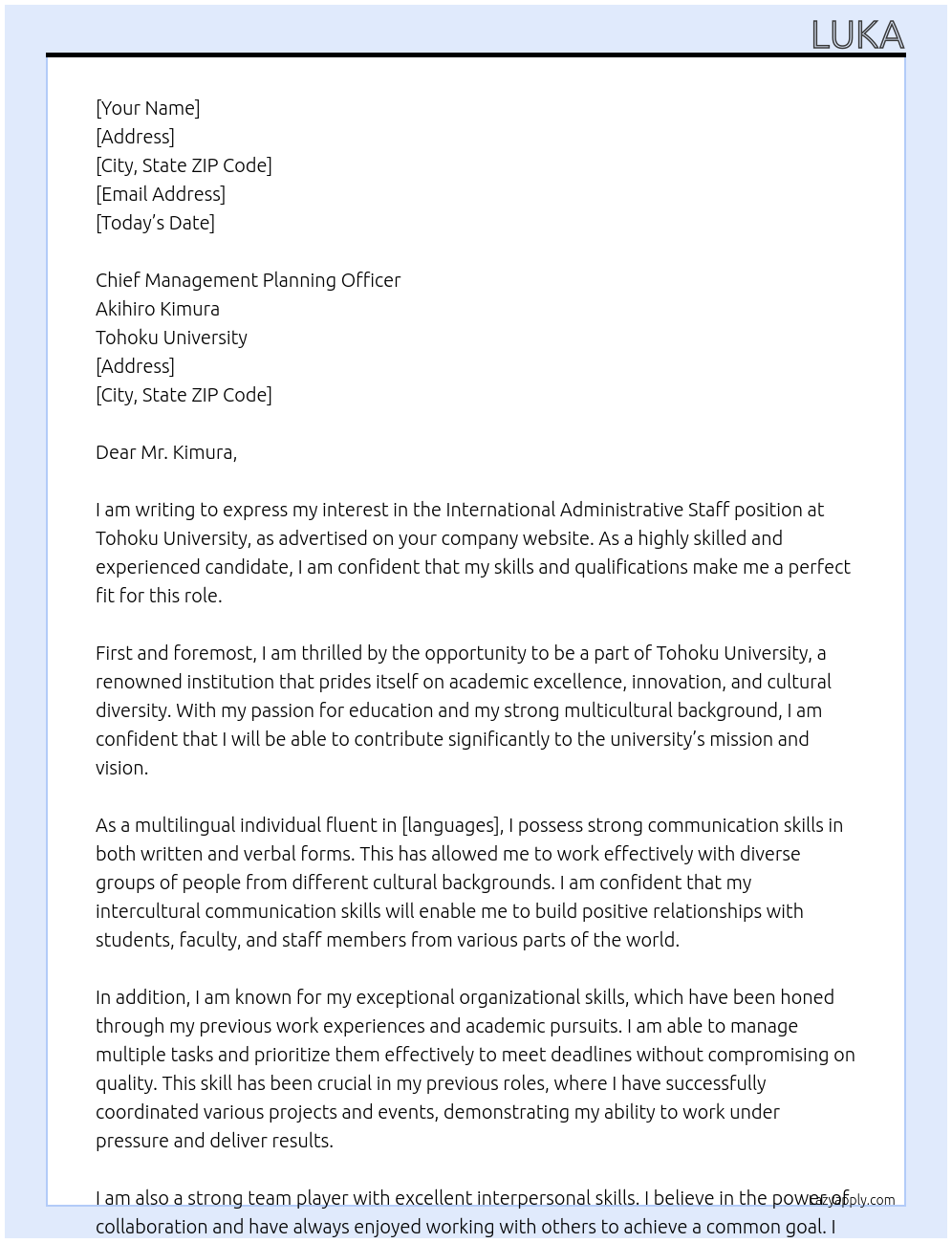Check out these international administrative staff cover letter sample and examples previously used by job seekers to land on job interviews as international administrative staff. Use our AI cover letter generator to create a personalized cover letter as international administrative staff.