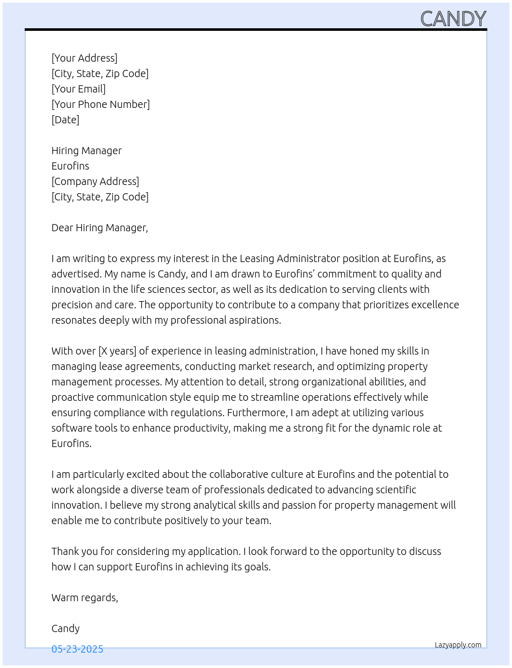 Check out these leasing administrator cover letter sample and examples previously used by job seekers to land on job interviews as leasing administrator. Use our AI cover letter generator to create a personalized cover letter as leasing administrator.