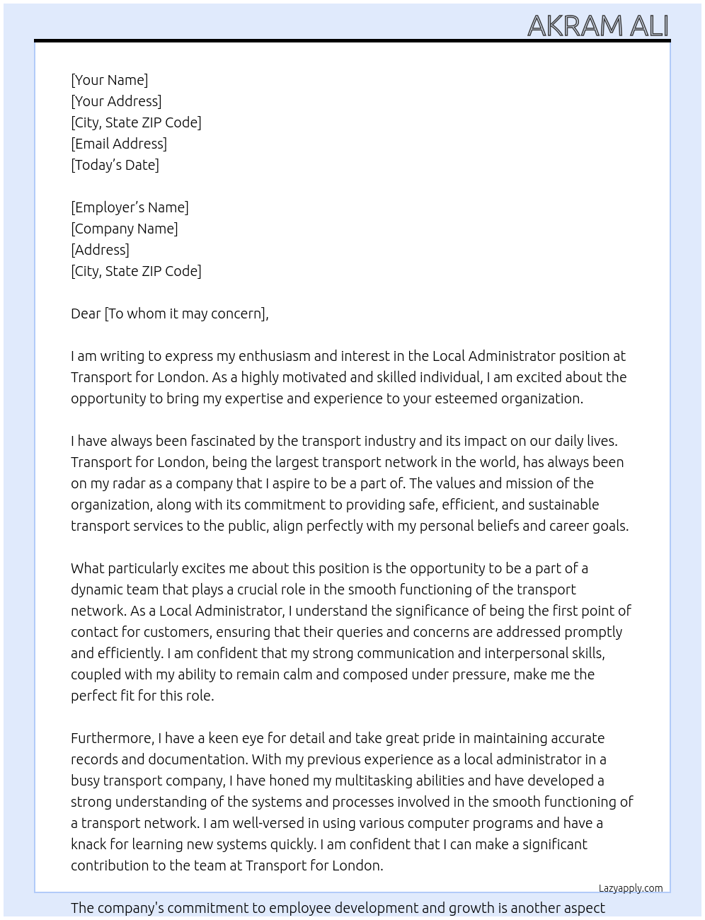 Local Administrator At Transport for London Cover Letter
