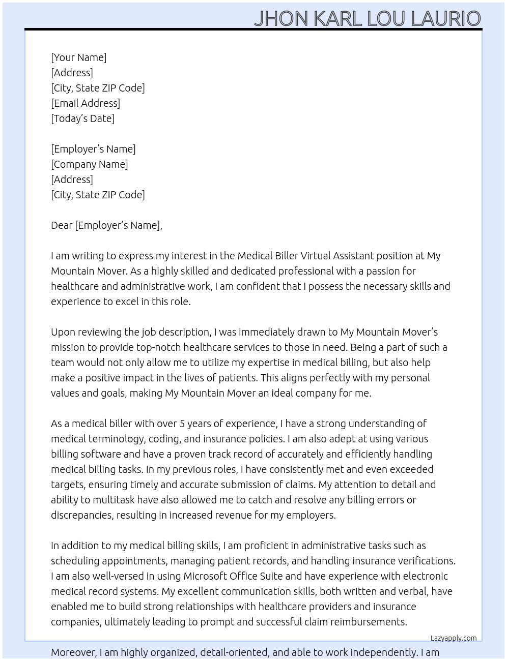 Medical Biller Virtual Assistant Cover Letter At my mountain mover