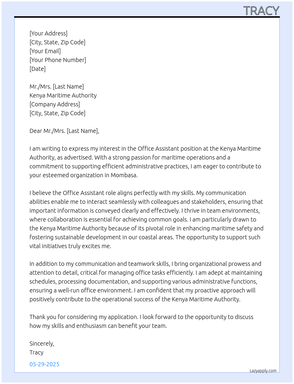 Office Assistant position Cover Letter At Kenya Maritime Authority