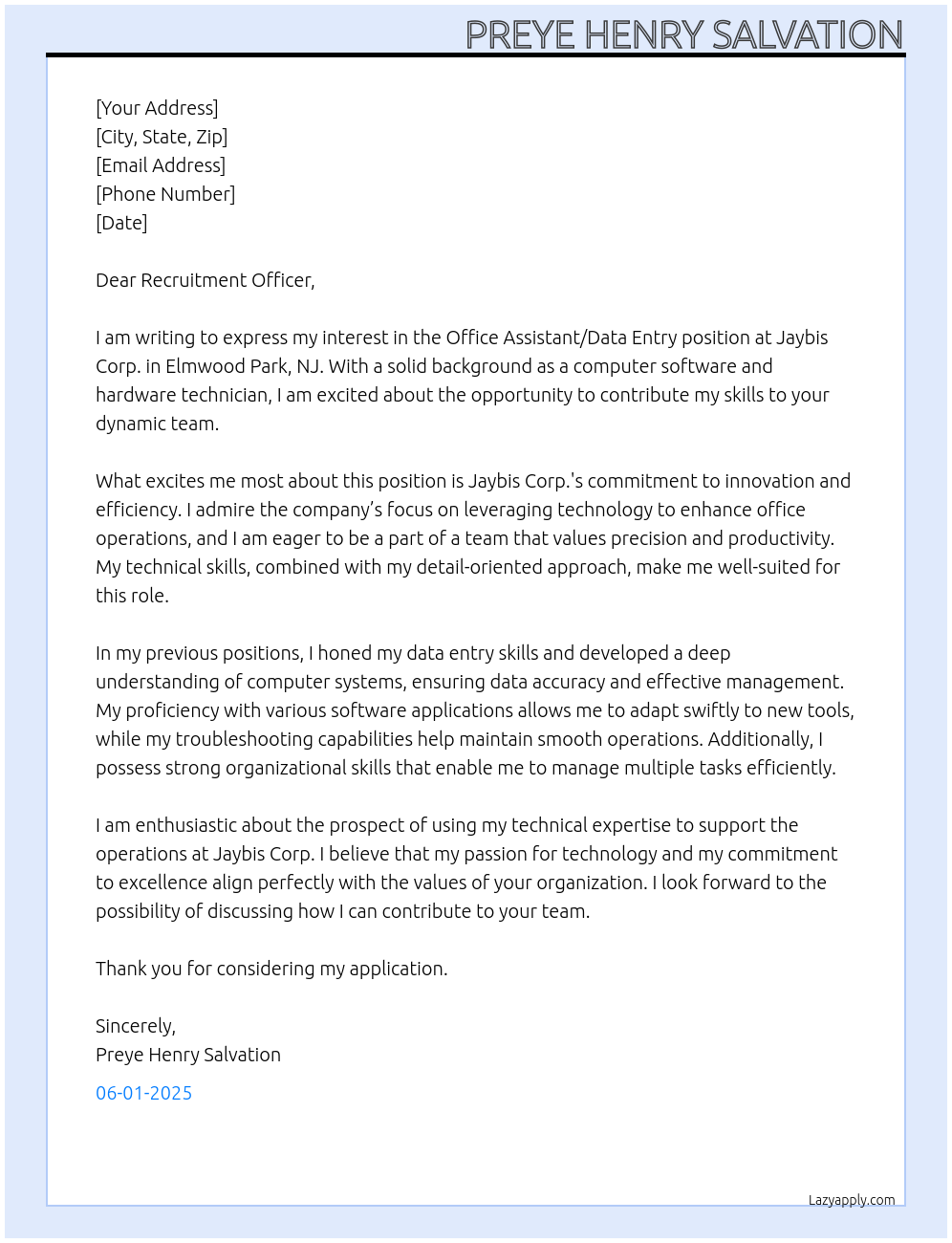 Office Assistant/Data Entry Cover Letter At Jaybis Corp. - Elmwood Park, NJ 07407