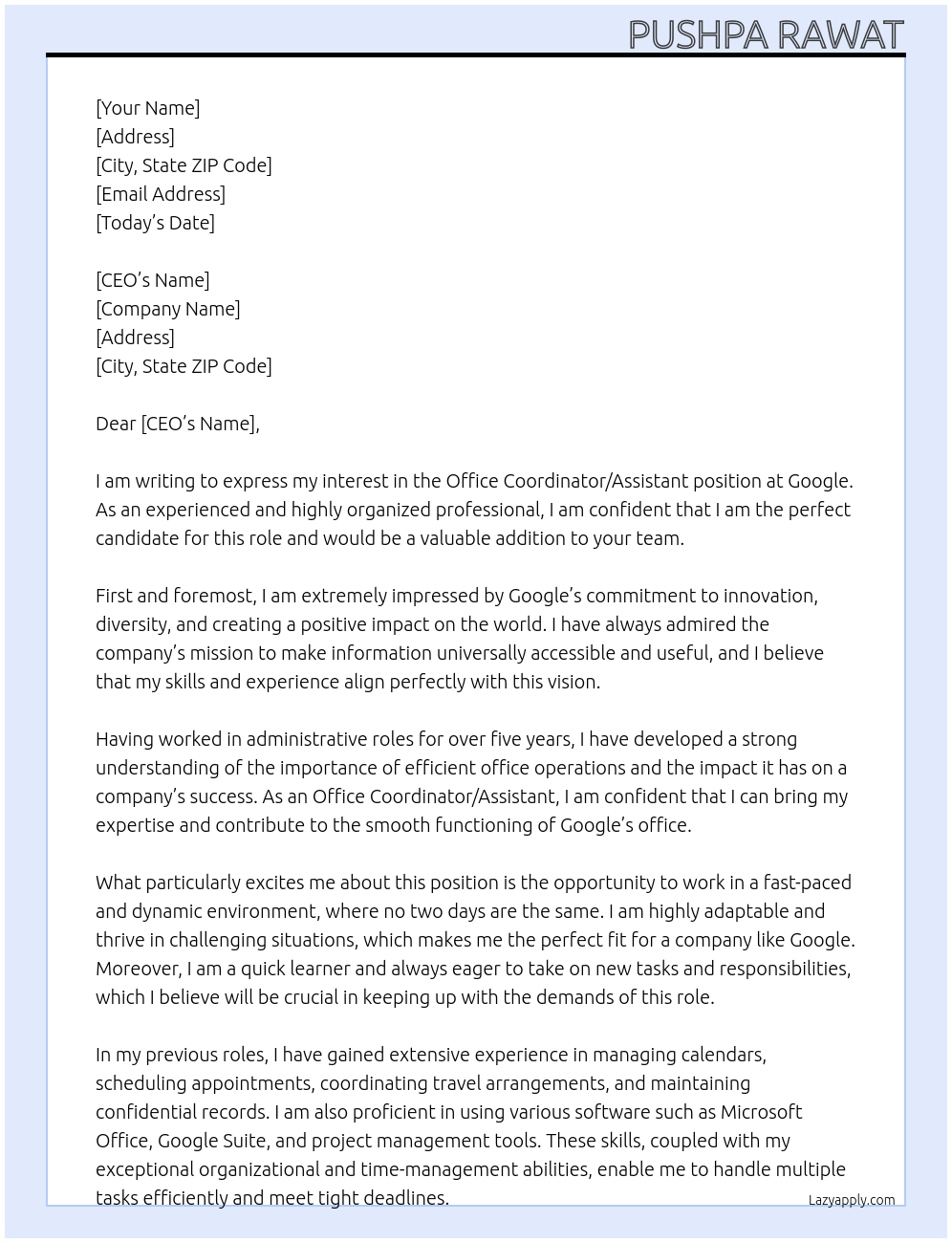 Office Coordinator / Assistant Cover Letter Examples And Template