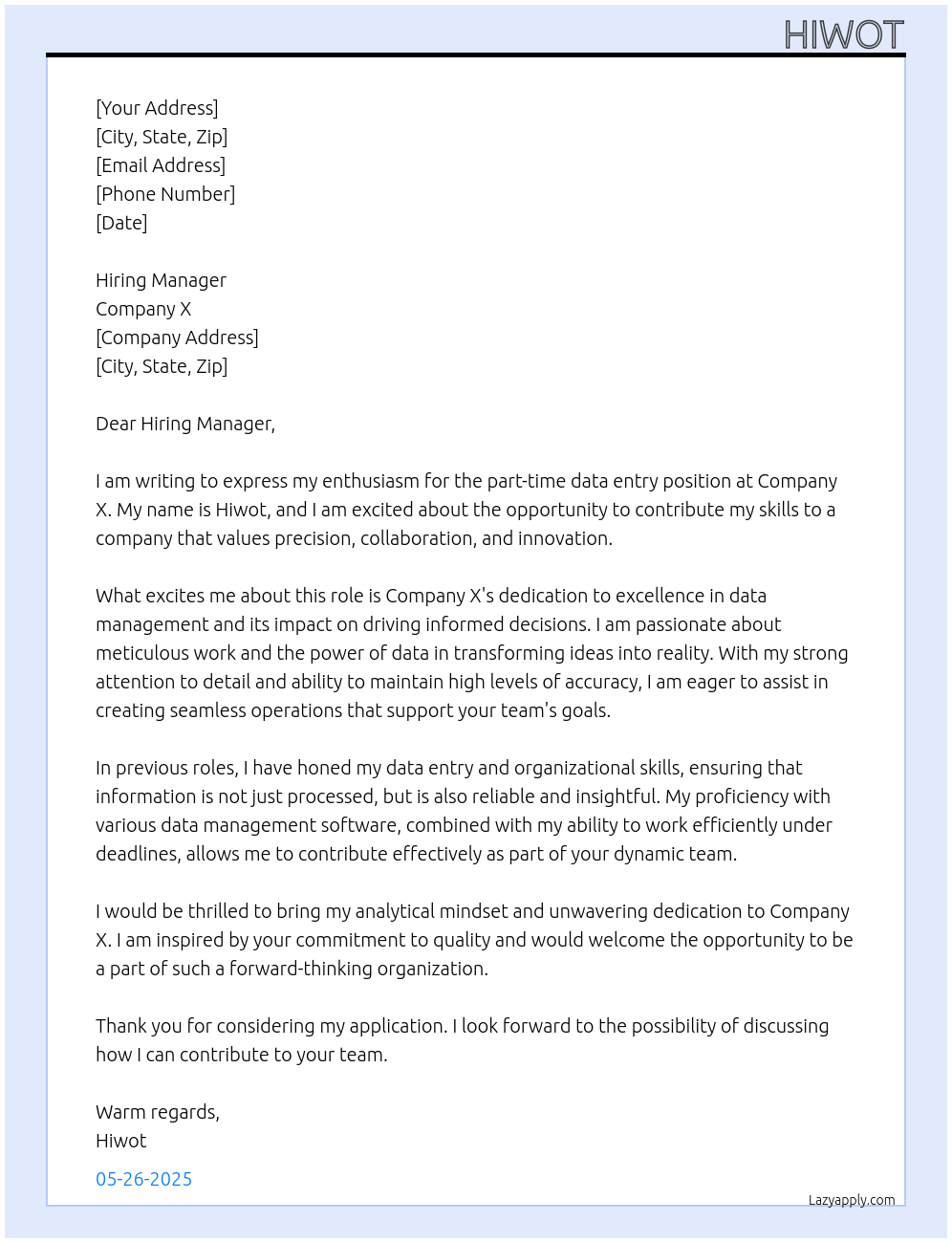 Check out these part time data entry cover letter sample and examples previously used by job seekers to land on job interviews as part time data entry. Use our AI cover letter generator to create a personalized cover letter as part time data entry.