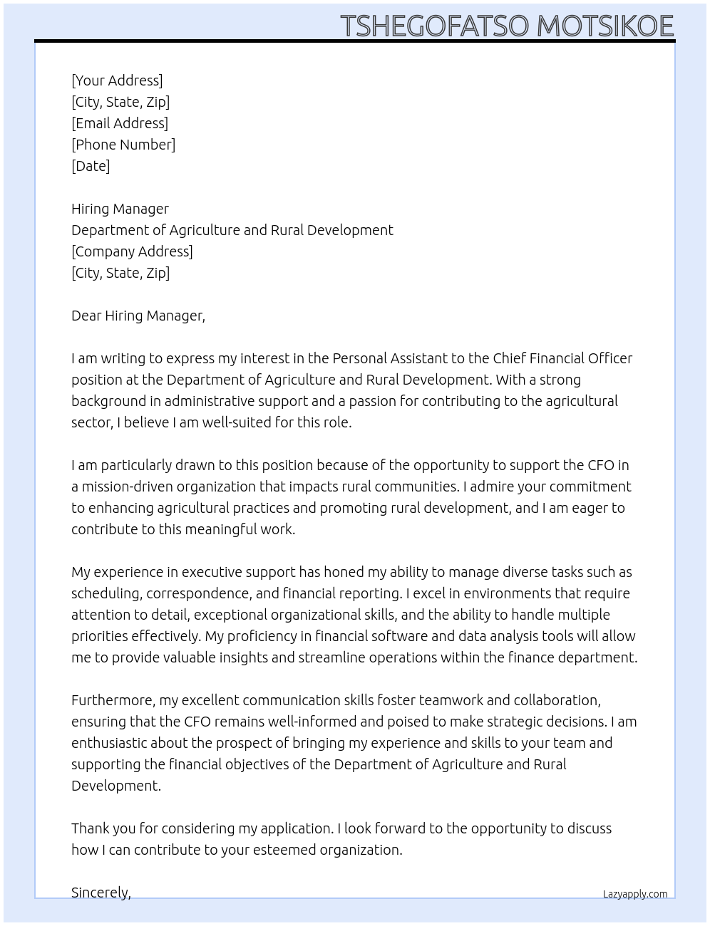 Personal Assistant to the Chief Financial Officer Cover Letter At Department of Agriculture and Rural Development