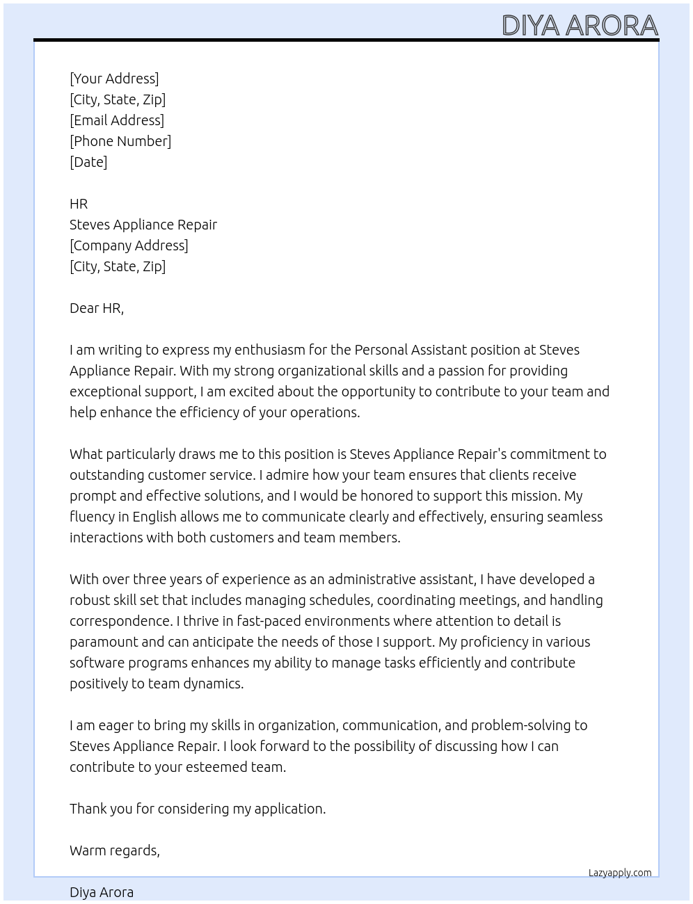 Personal assistant with knowledge of English Cover Letter At Steves Appliance Repair