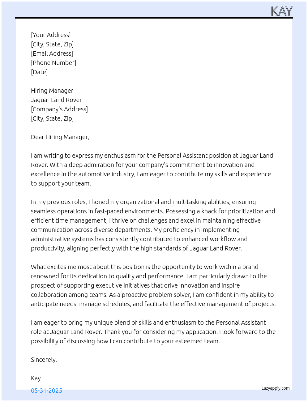 Check out these personal assistat cover letter sample and examples previously used by job seekers to land on job interviews as personal assistat. Use our AI cover letter generator to create a personalized cover letter as personal assistat.