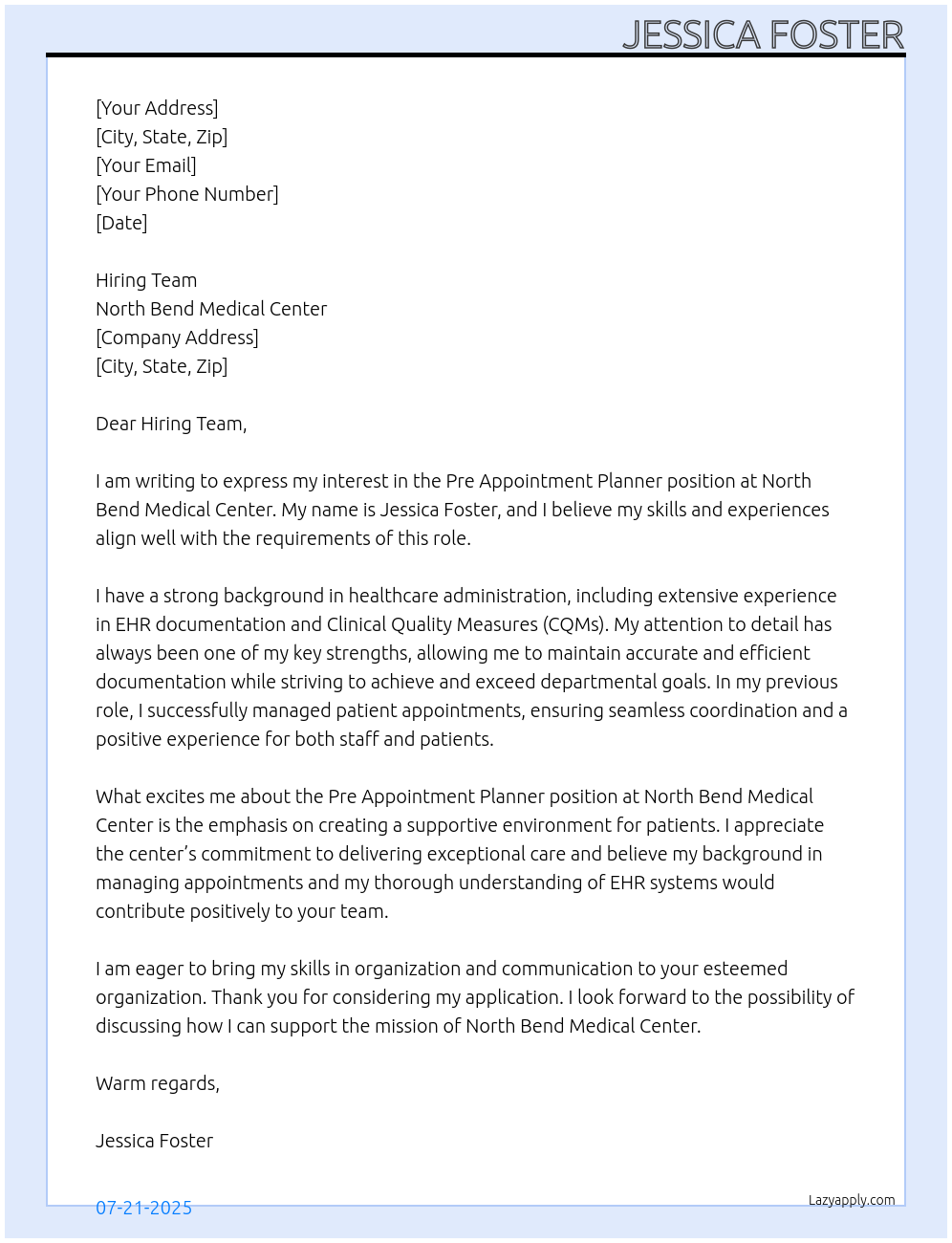 Pre Appointment Planner Cover Letter At North Bend Medical Center