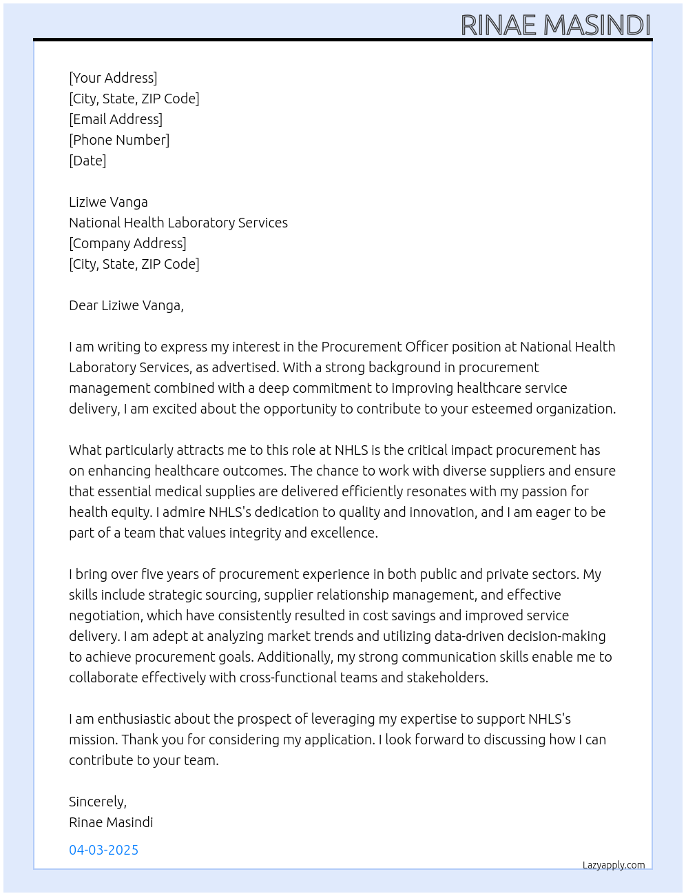 procument officer Cover Letter At National health laboratory servicse