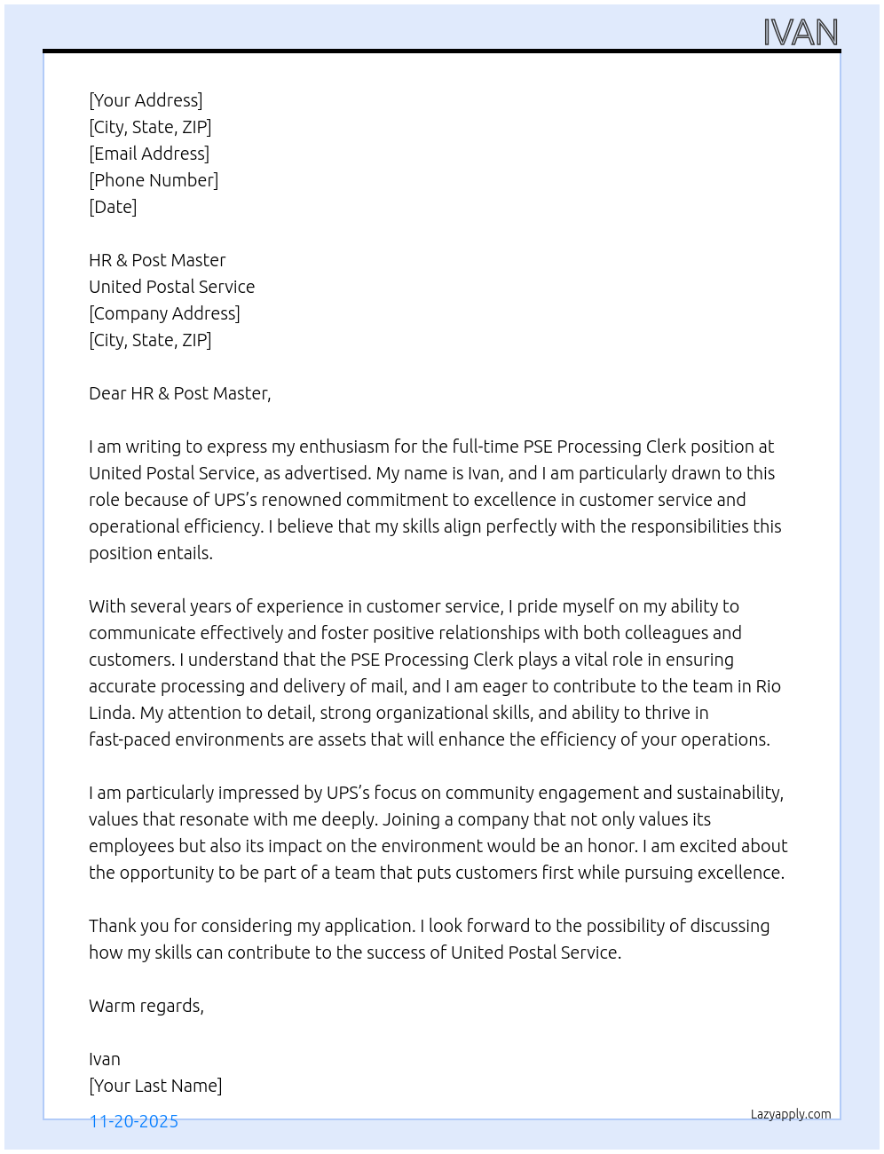 PSE processing clerk Cover Letter At United Postal Service