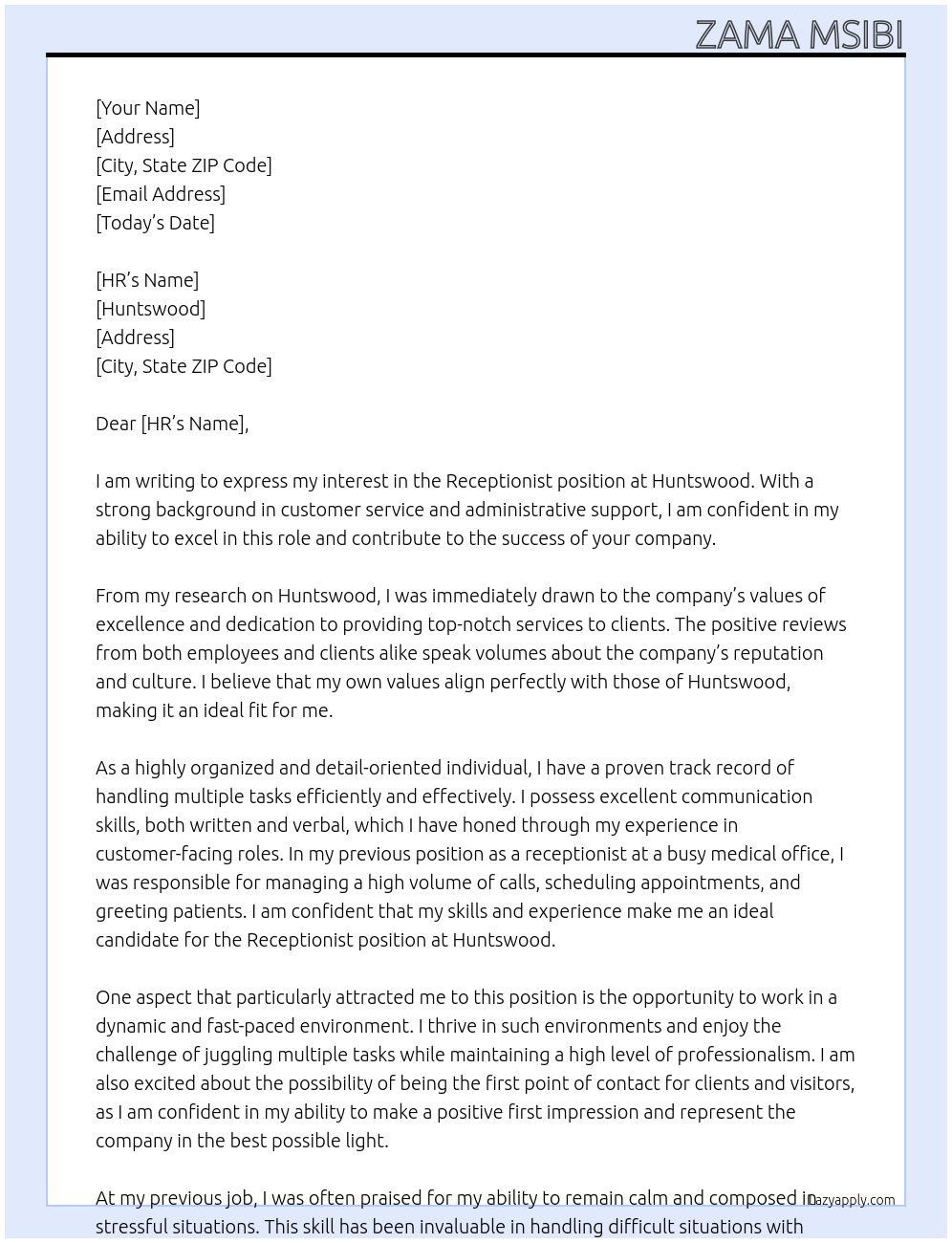 rececptionist Cover Letter At huntswood