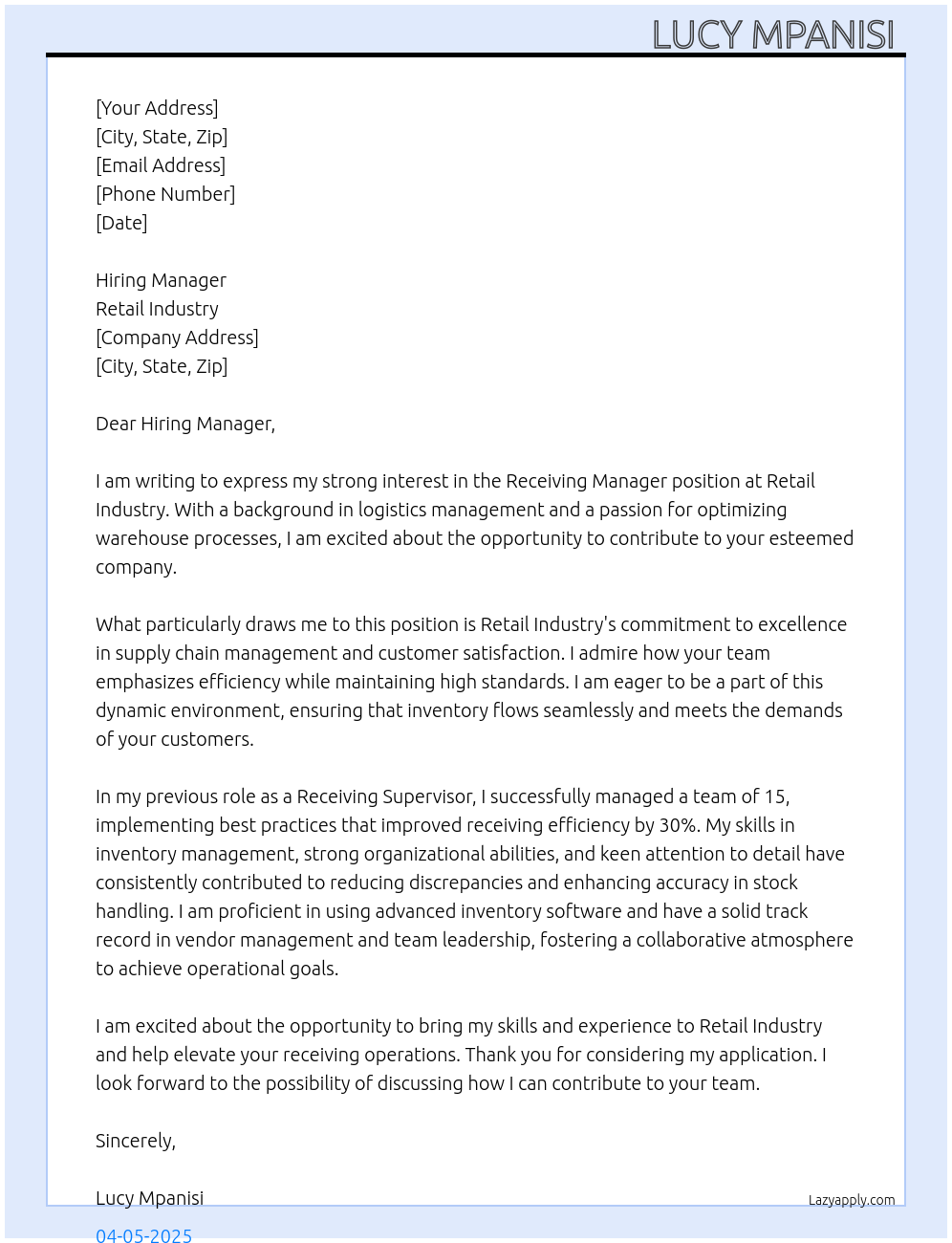 Check out these receiving manager cover letter sample and examples previously used by job seekers to land on job interviews as receiving manager. Use our AI cover letter generator to create a personalized cover letter as receiving manager.