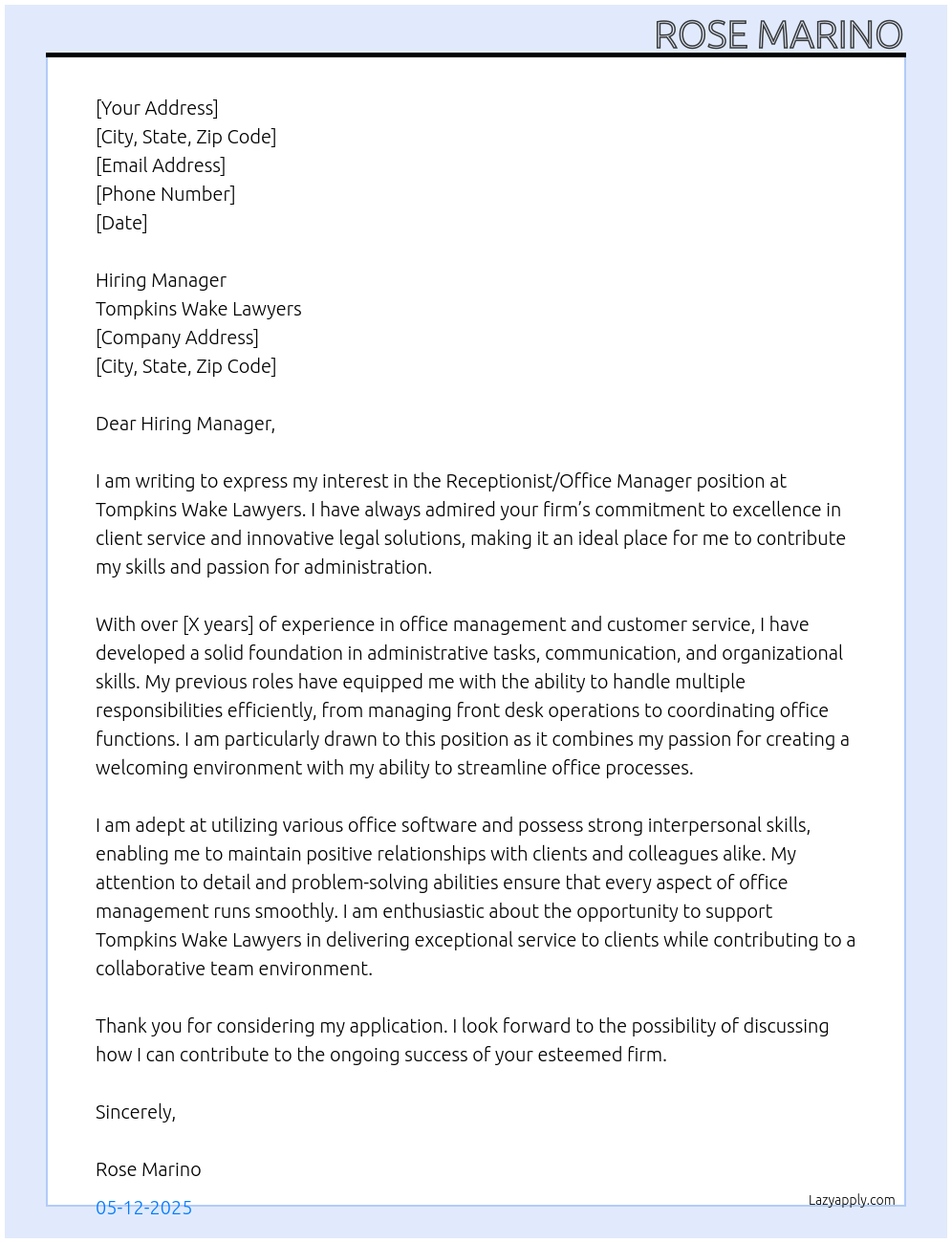 Receptionist / Office Manager Cover Letter At Tompkin Wake Lawyers
