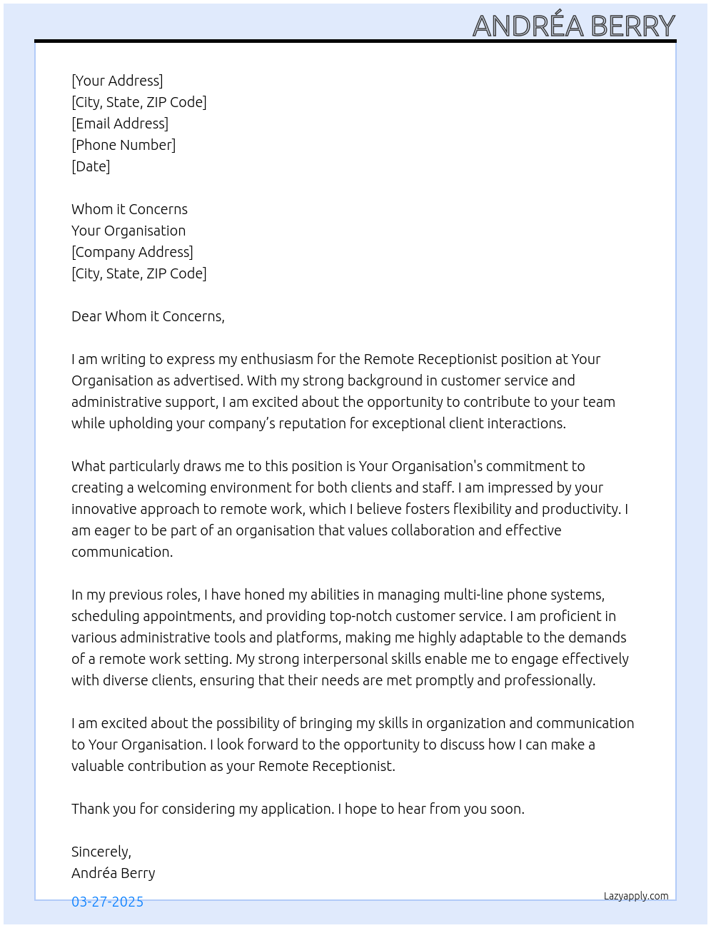 Check out these remote receptionist cover letter sample and examples previously used by job seekers to land on job interviews as remote receptionist. Use our AI cover letter generator to create a personalized cover letter as remote receptionist.