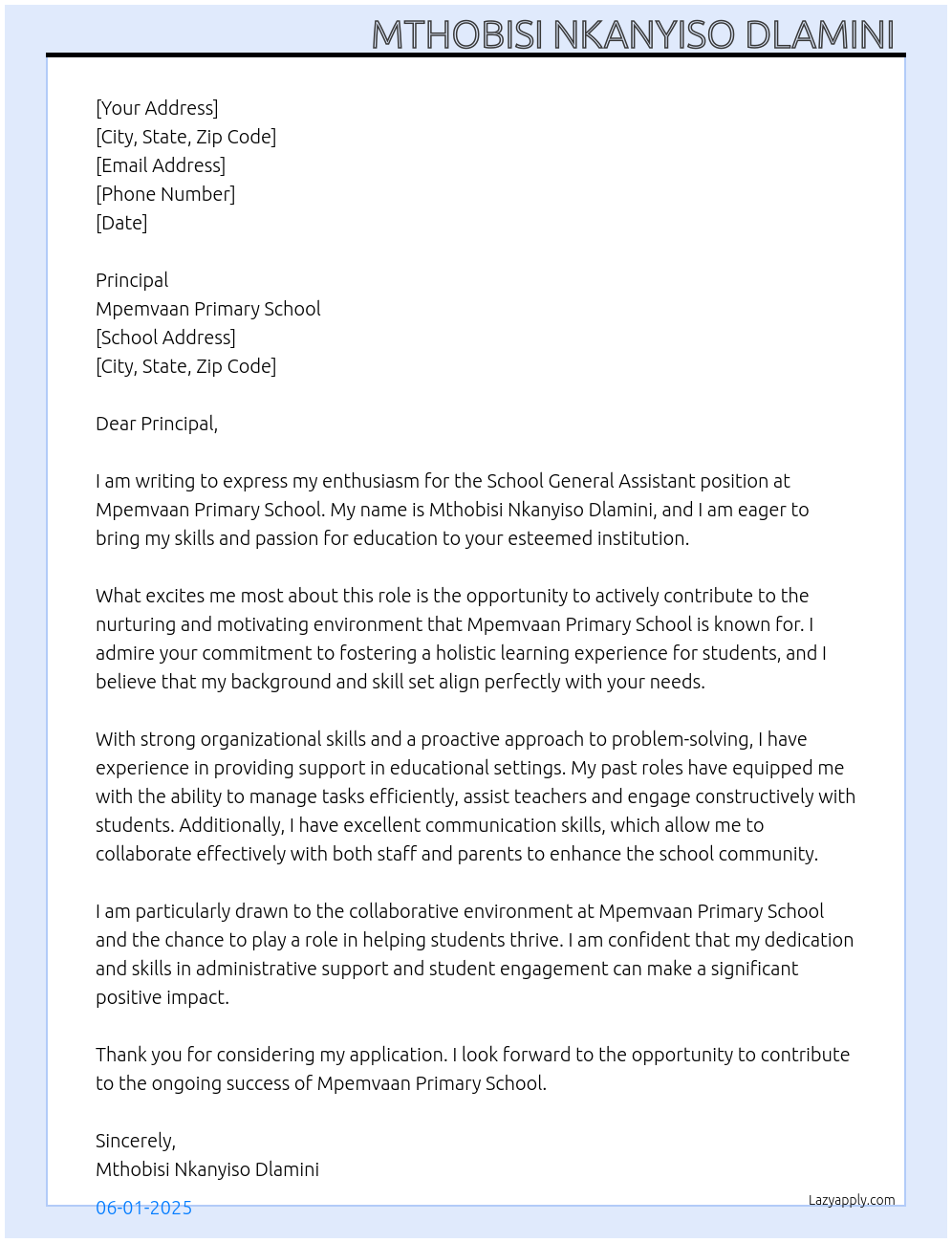 Check out these school general assistant cover letter sample and examples previously used by job seekers to land on job interviews as school general assistant. Use our AI cover letter generator to create a personalized cover letter as school general assistant.