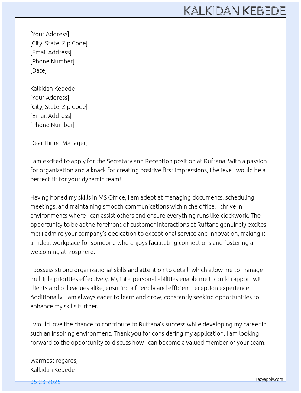Check out these secretary and reception cover letter sample and examples previously used by job seekers to land on job interviews as secretary and reception. Use our AI cover letter generator to create a personalized cover letter as secretary and reception.
