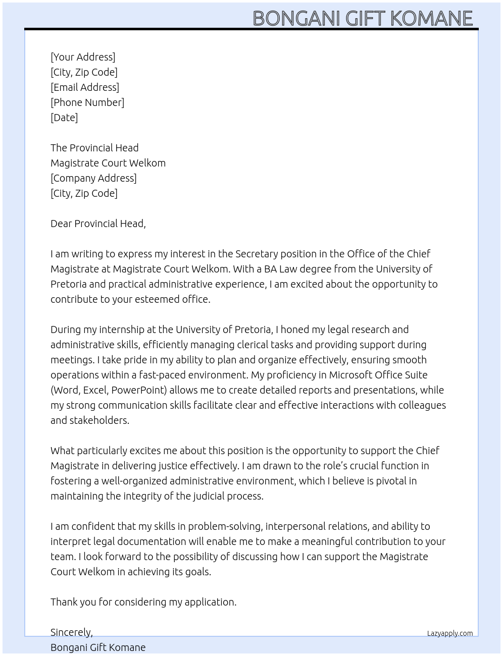 Cover letter for secretary in the office of the chief magistrate’s office - LazyApply