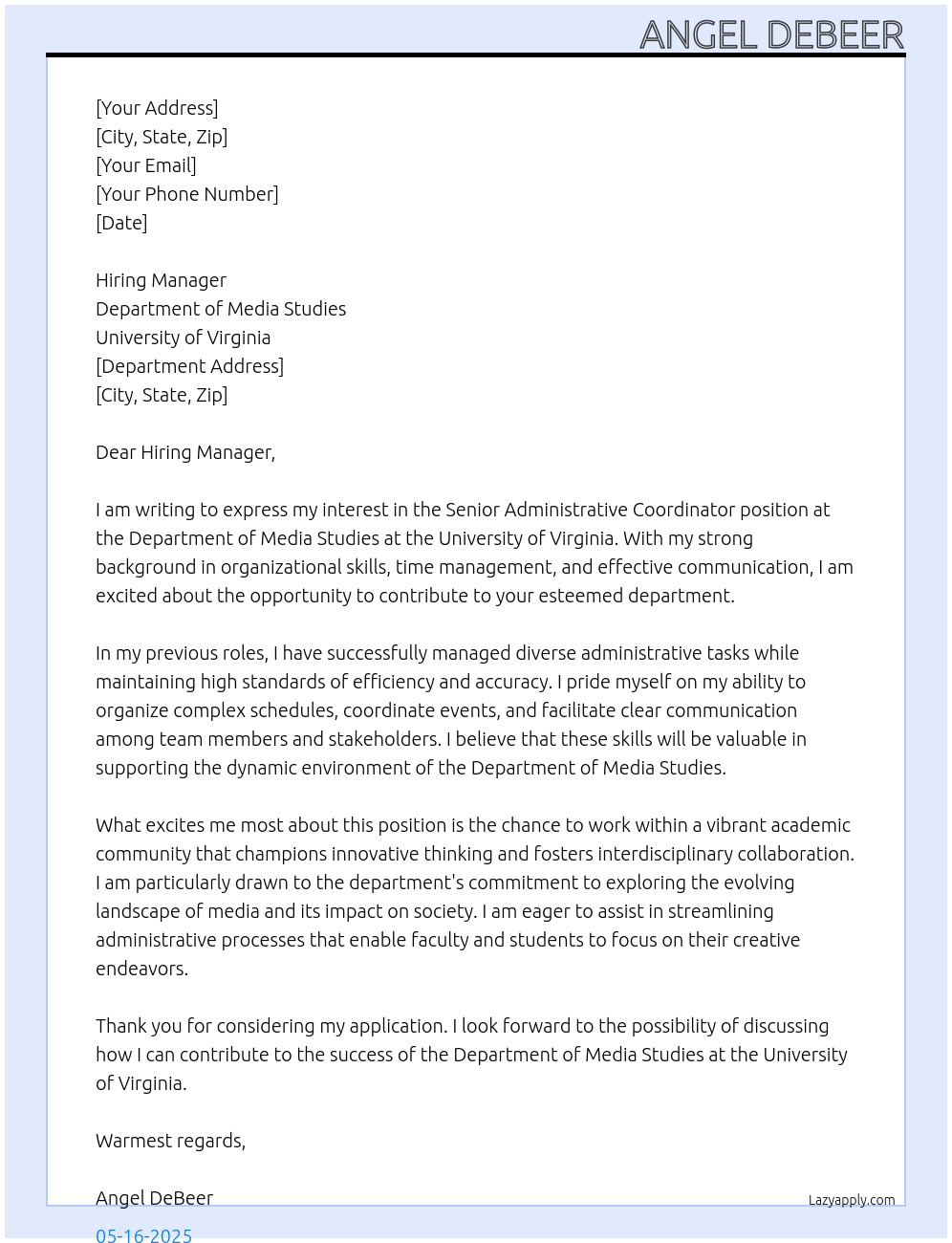 Senior Administrative Coordinator Cover Letter At Department of Media Studies at the University of Virginia