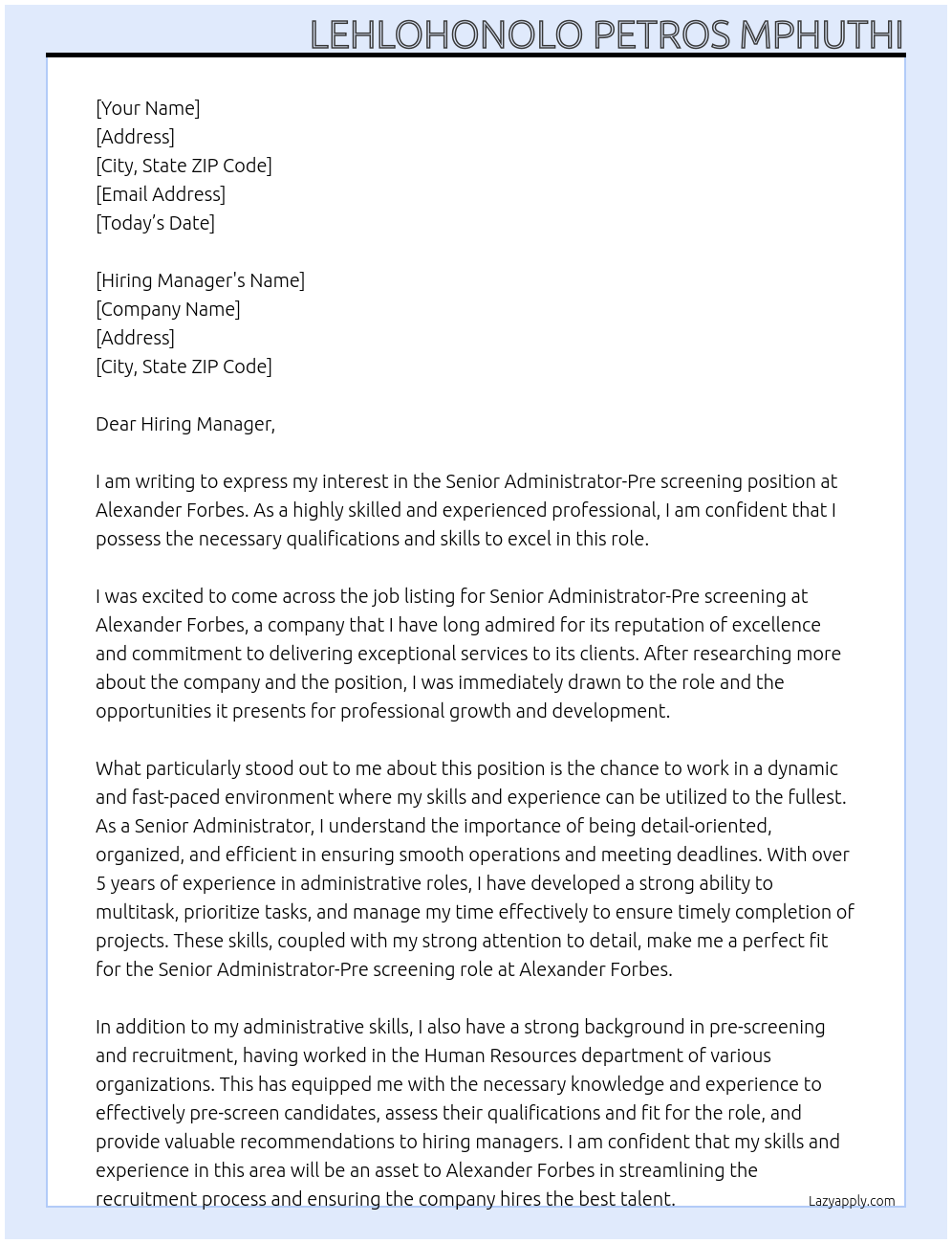 Senior Administrator-Pre screening Cover Letter At Alexander Forbes