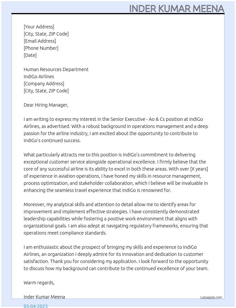 Senior Executive-Ao &Cs Cover Letter At Indigo Airlines