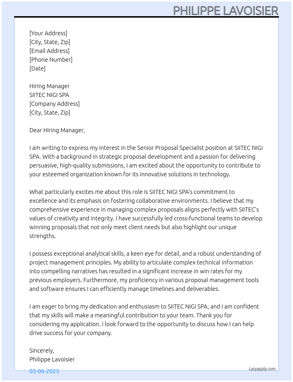 senior proposal specialist Cover Letter At SIITEC NIGI SPA