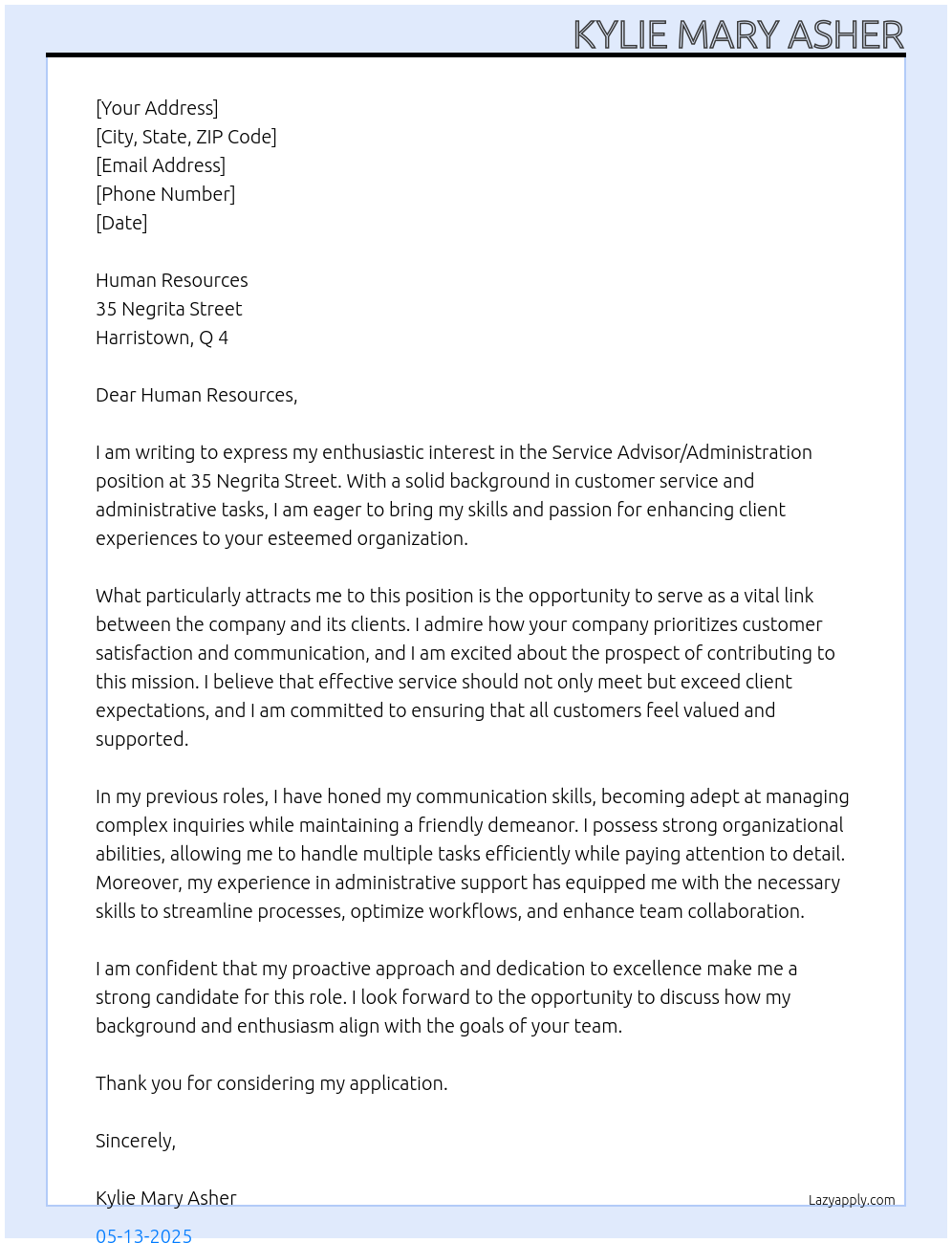 Service Advisor / Administration Cover Letter At 35 NEGRITA STREET HARRISTOWN Q 4