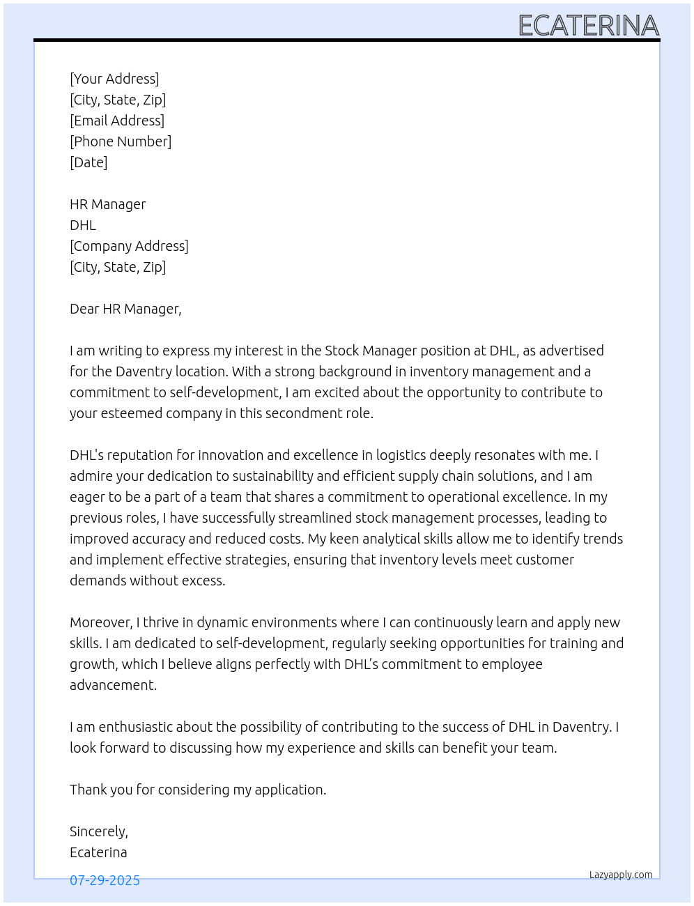 Stock manager At DHL Cover Letter