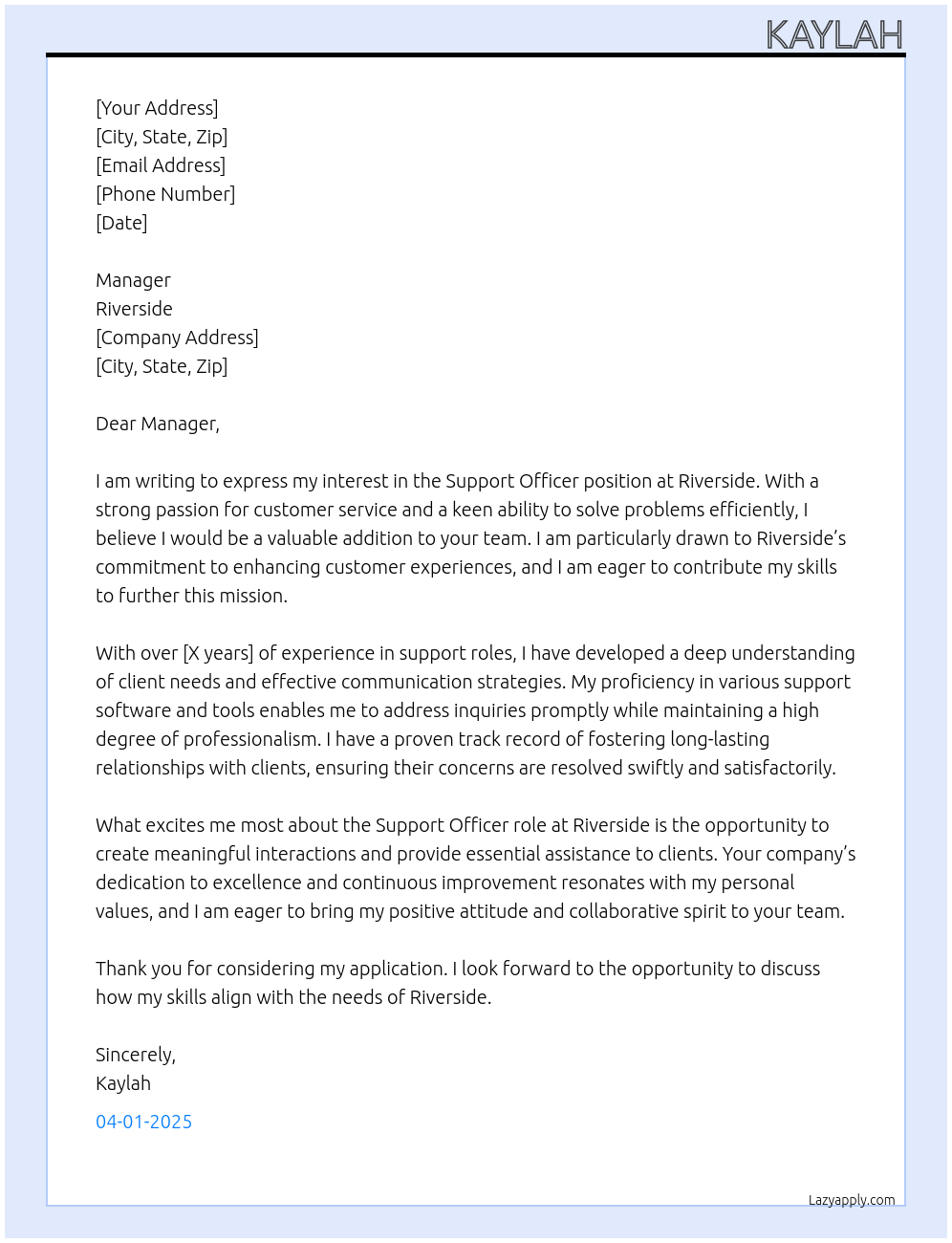Check out these support officer cover letter sample and examples previously used by job seekers to land on job interviews as support officer. Use our AI cover letter generator to create a personalized cover letter as support officer.