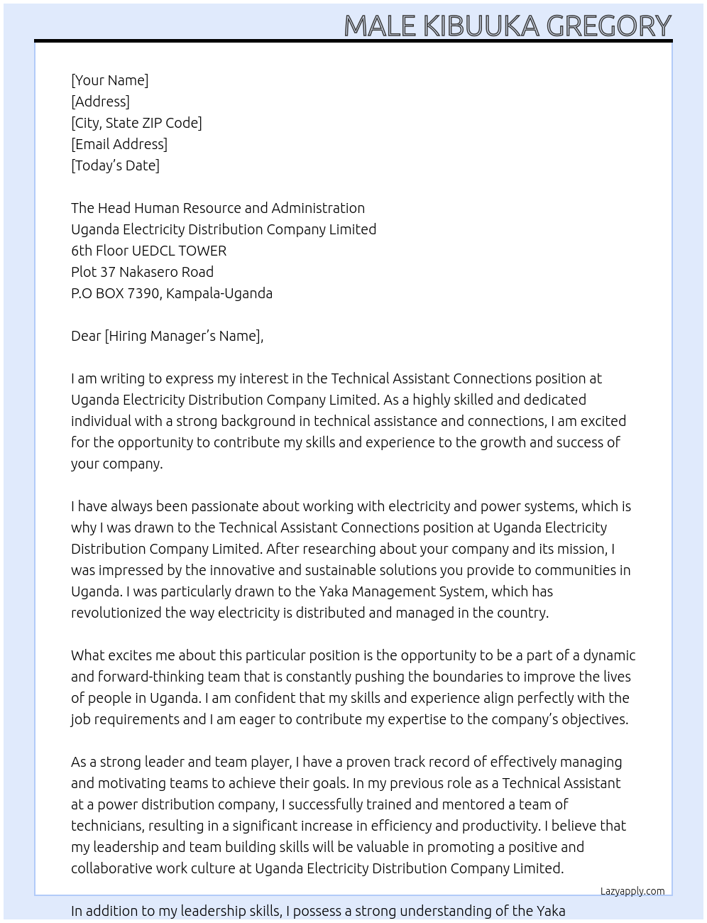 Technical Assistant Connections Cover Letter At Uganda Electricity Distribution Company Limited