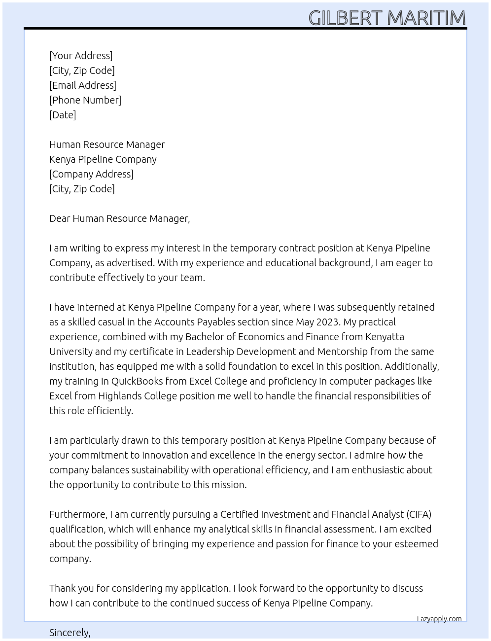 Temporary contract Cover Letter At Kenya pipeline company