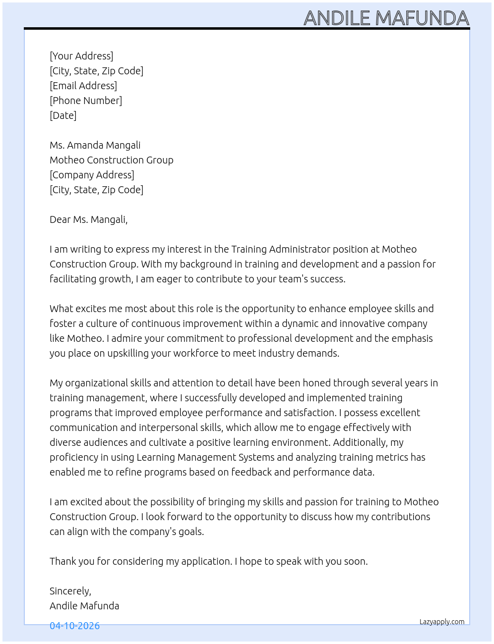 Training Administrator  At Motheo Construction Group  Cover Letter