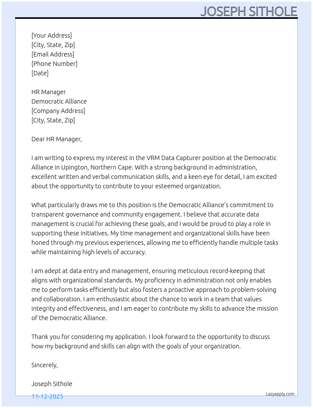 Cover letter for vrm data capturer: upington - northern cape - LazyApply
