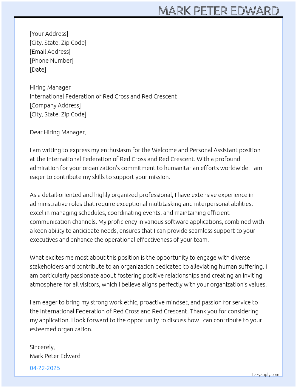 Welcome and personal assistant Cover Letter At International Federation of Red Cross and Red Crescent