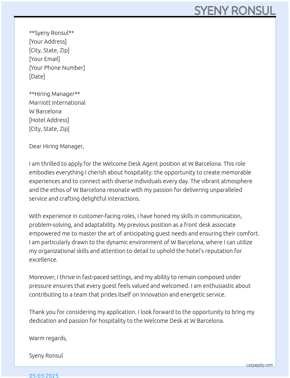 Check out these welcome desk agent cover letter sample and examples previously used by job seekers to land on job interviews as welcome desk agent. Use our AI cover letter generator to create a personalized cover letter as welcome desk agent.