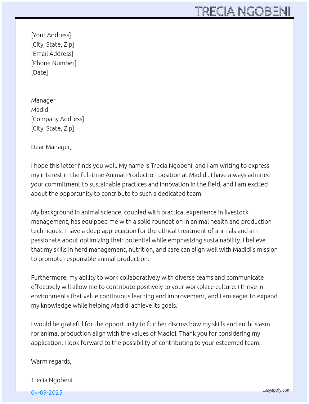 Check out these animal production cover letter sample and examples previously used by job seekers to land on job interviews as animal production. Use our AI cover letter generator to create a personalized cover letter as animal production.