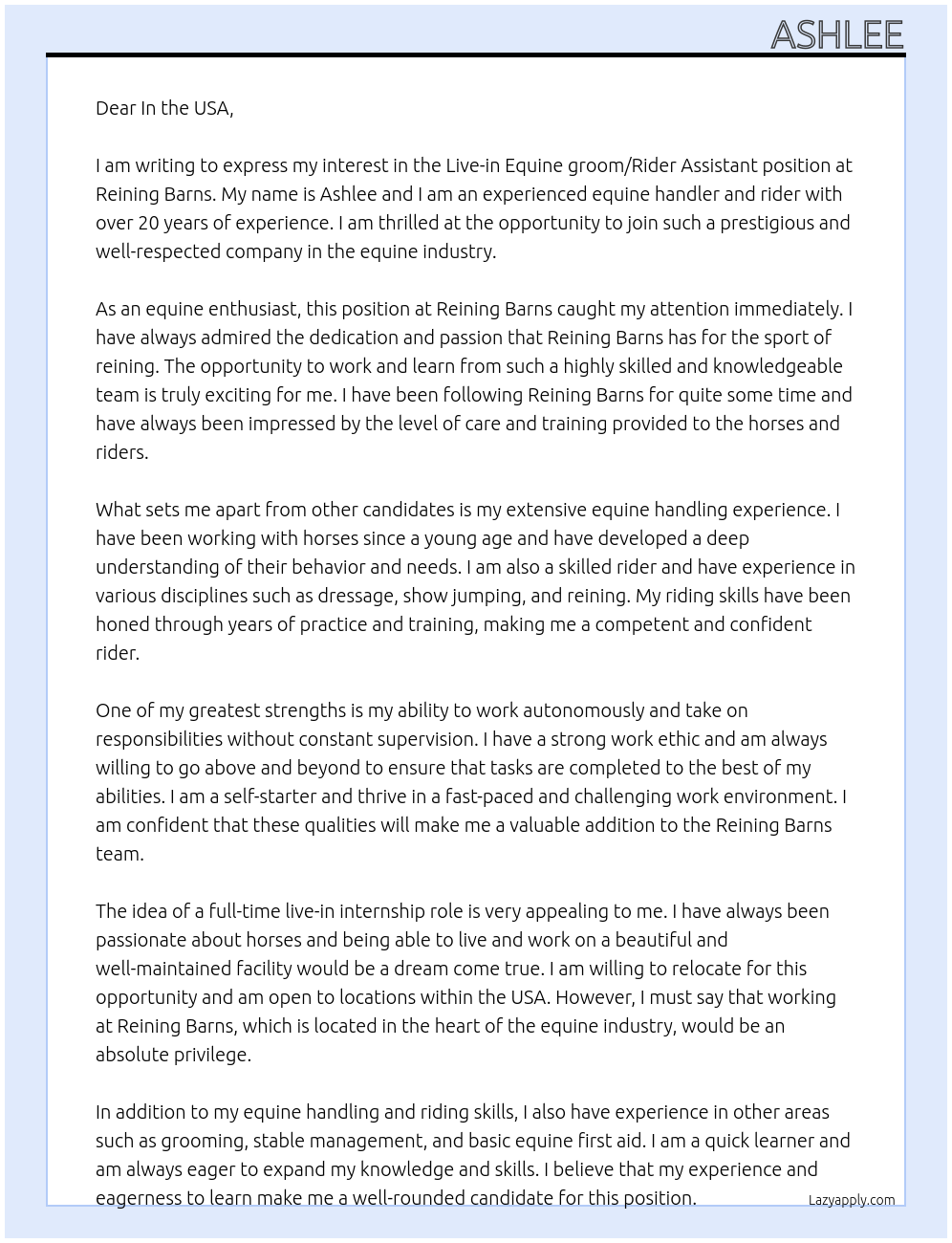 Live-in Equine groom/Rider Assistant Cover Letter At Reining barns