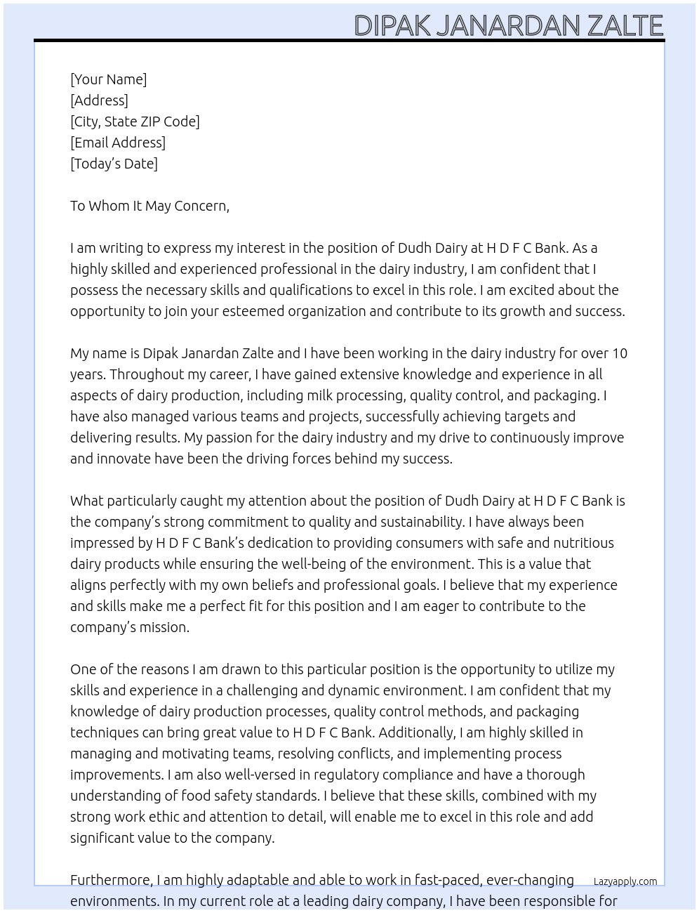 Check out these dudh dairy cover letter sample and examples previously used by job seekers to land on job interviews as dudh dairy. Use our AI cover letter generator to create a personalized cover letter as dudh dairy.