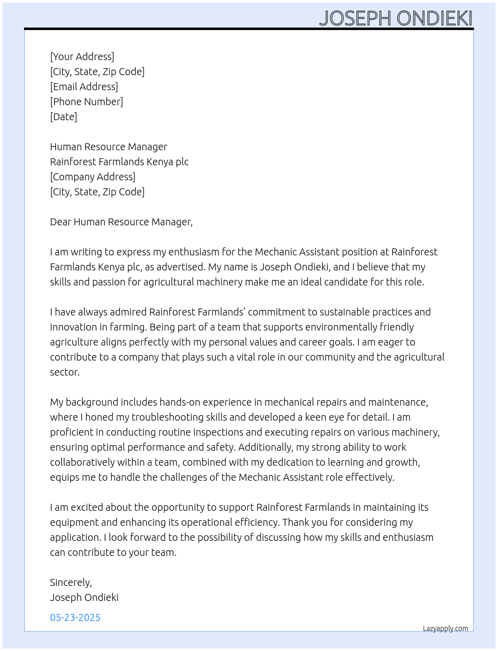 Mechanic assistant Cover Letter At Rainforest Farmlands Kenya plc
