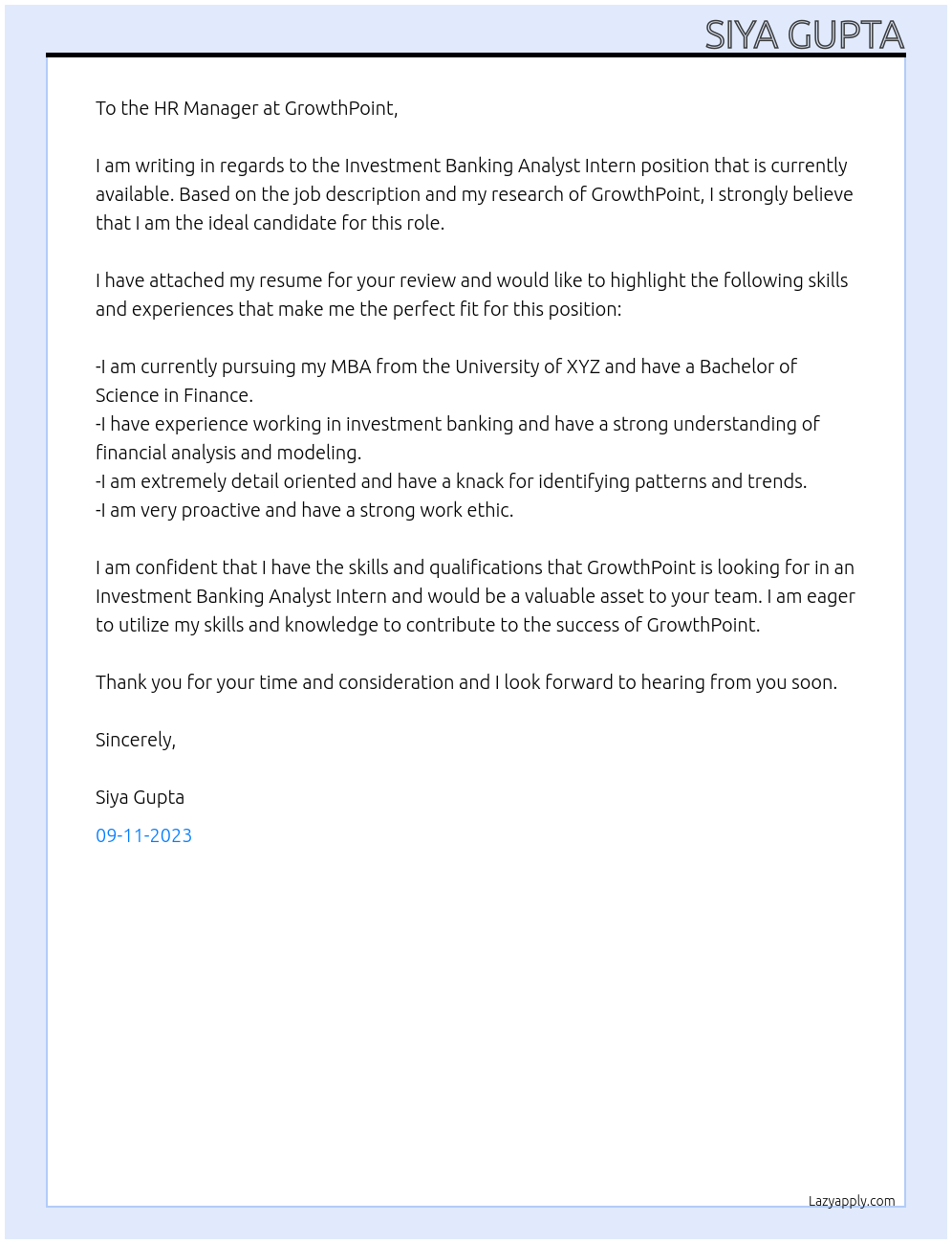 Investment Banking Analyst Intern Cover Letter At GrowthPoint