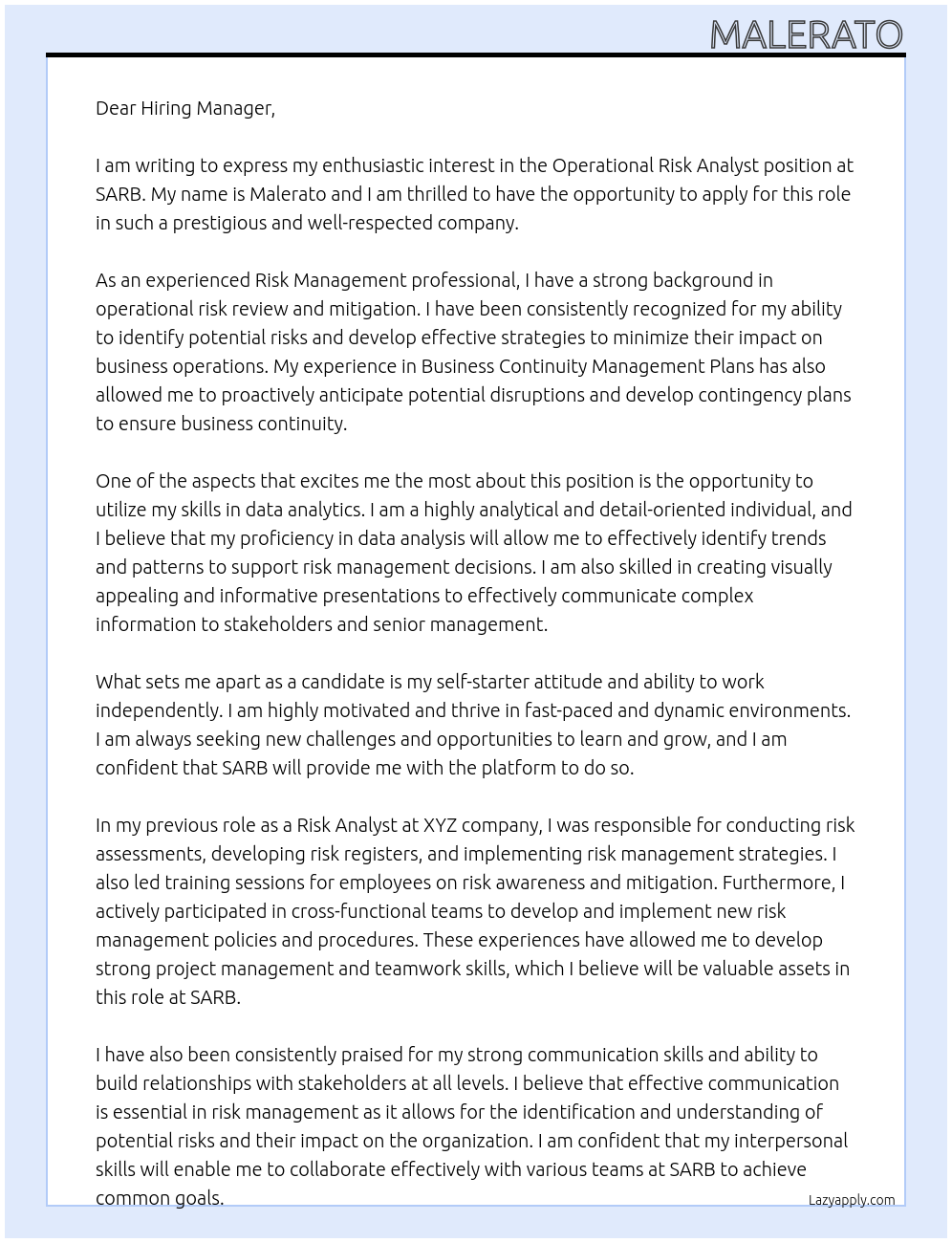 Cover letter for operational risk analyst - LazyApply