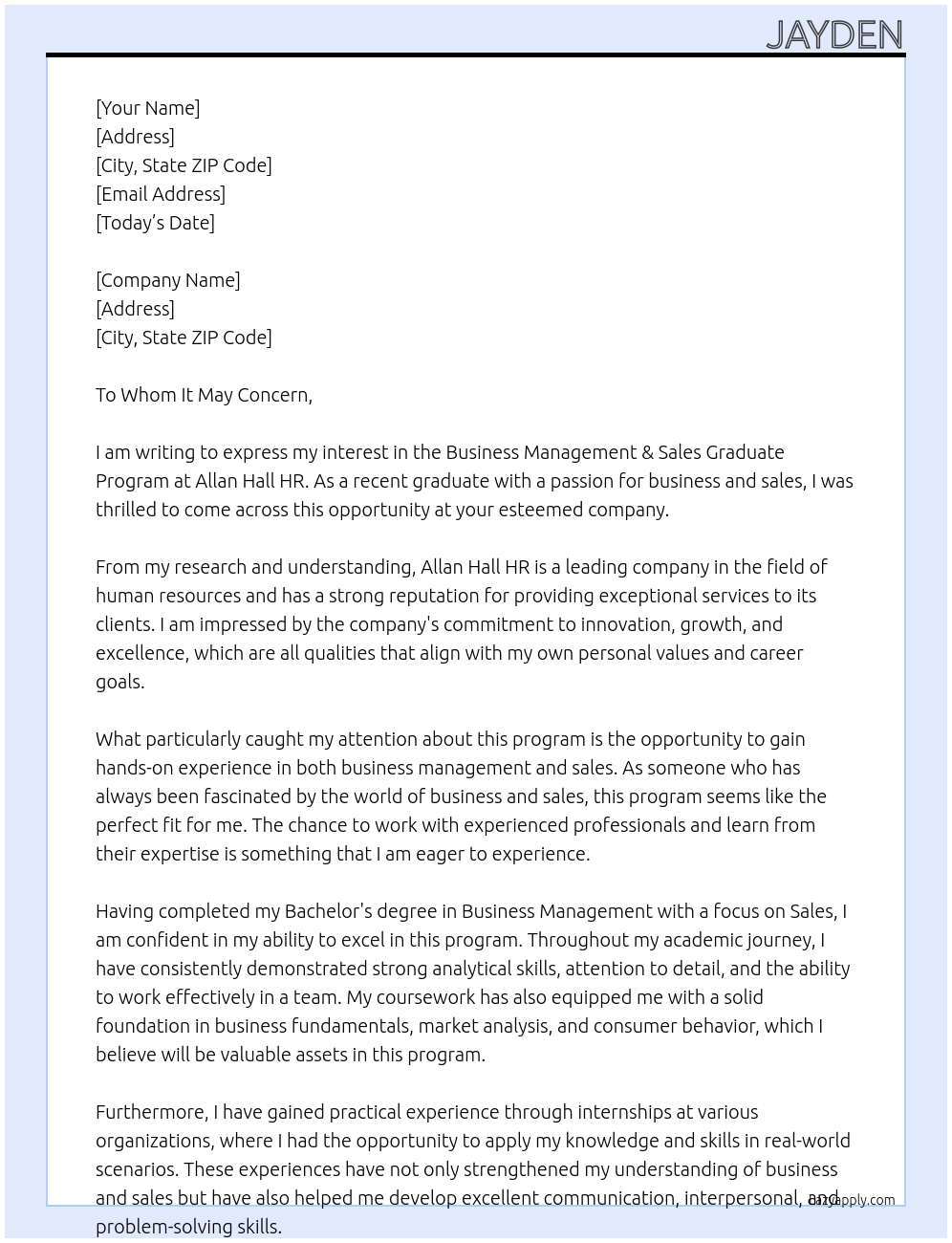 Business Management & Sales Graduate Program Cover Letter At Allan Hall HR