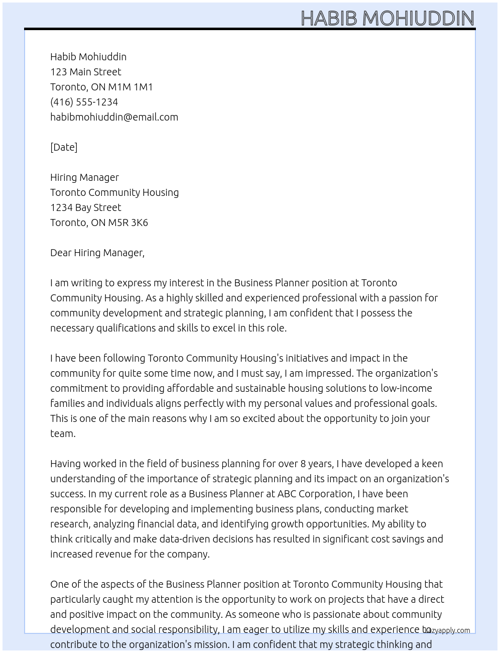 Business Planner Cover Letter At Toronto Community Housing