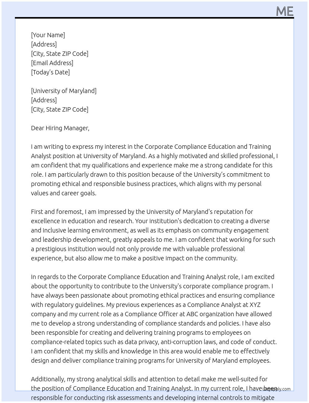 Corporate Compliance Education and Training Analyst Cover Letter At University of Maryland