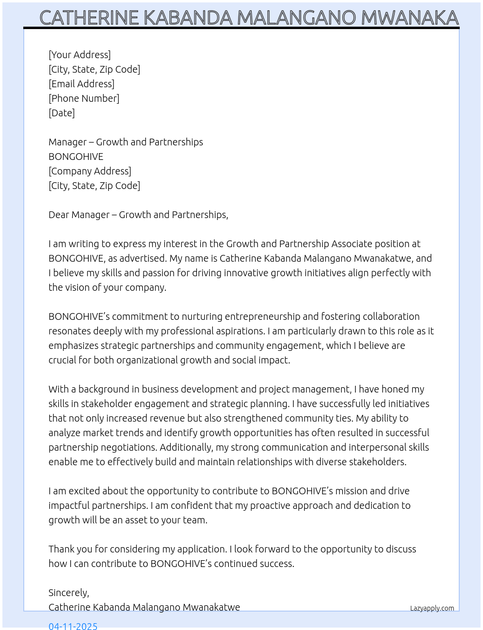 Growth and Partnership Associate Cover Letter At BONGOHIVE