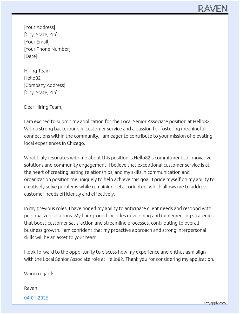 Check out these local senior associate cover letter sample and examples previously used by job seekers to land on job interviews as local senior associate. Use our AI cover letter generator to create a personalized cover letter as local senior associate.